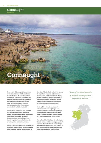 Connaught The province of Connaught (Connacht) lies in the West of Ireland with its coastline on the Atlantic Ocean. The counties of Mayo, Sligo, Leitrim, Galway and Roscommon are within its boundary. Historically, Connaught has retained its rich Gaelic heritage and today still has communities where the Irish language is spoken. These regions are collectively called the Gaeltacht. Connaught has some of the most beautiful and unspoilt countryside to be found in Ireland, including the spectacular mountainous landscape of Connemara. The primary business centre of Connaught, and most densely populated area, is the thriving city of Galway to the south of the province. Galway is the capital of the West of Ireland. The streets and buildings of this ancient town have many interesting features, and its position on