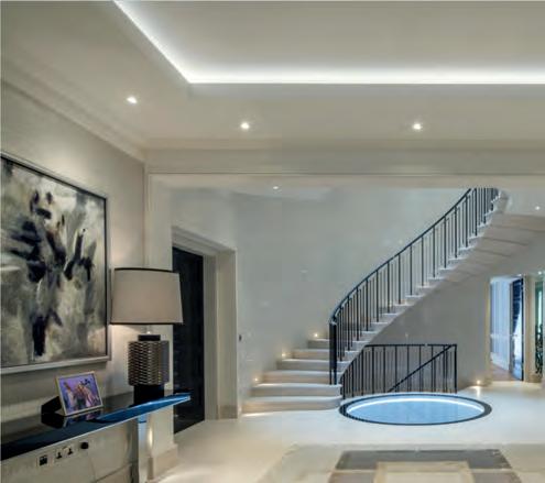 Inside, the home is as indulgent as it is expansive. Spanning an astonishing 16,749 sq. ft across four oors, it greets visitors with a soaring entrance atrium before opening into grand entertaining spaces. Six-bedroom suites, including a principal suite with a bathroom larger than many London ats, provide private sanctuaries, while two further sta bedrooms keep everything running smoothly.