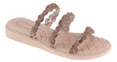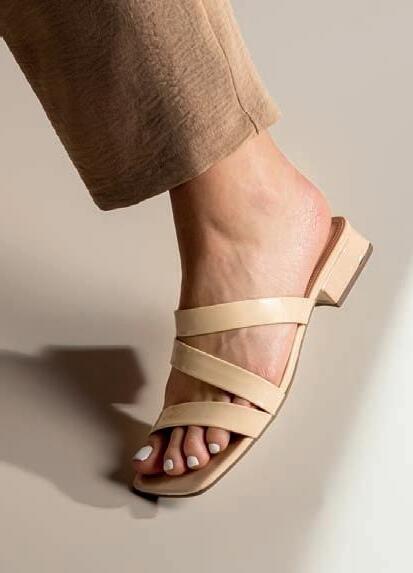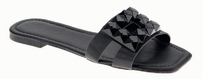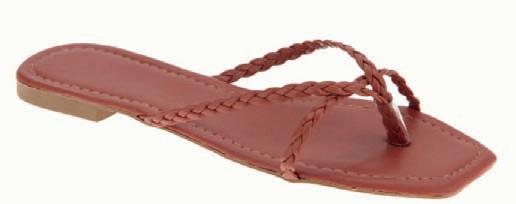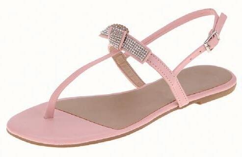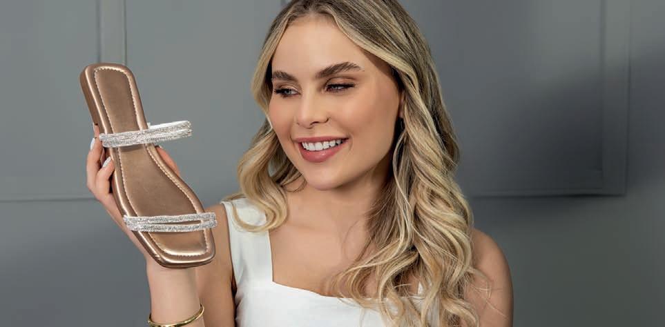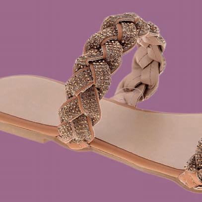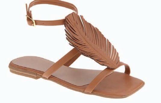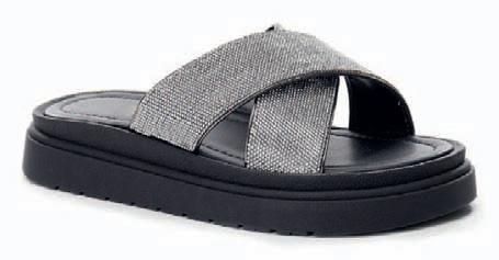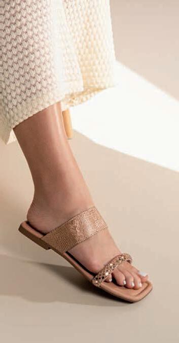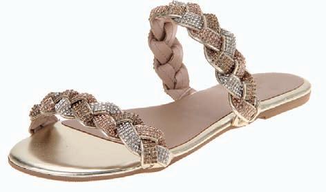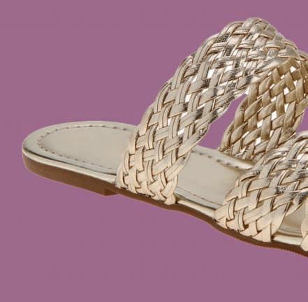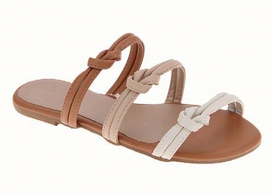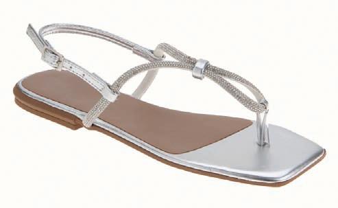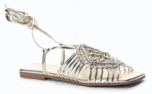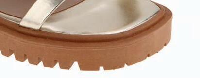 Sandália rasteira, cabedal em PU e detalhe metalizado, forração em PU, palmilha em látex forrada em PU, solado em micro, salto forrado em PU