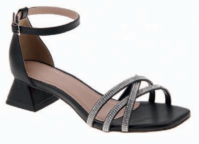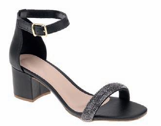 Sandália, cabedal em PU com enfeite strass, forração em PU, palmilha em látex forrada em PU, solado laqueado, salto forrado em PU 8 cm