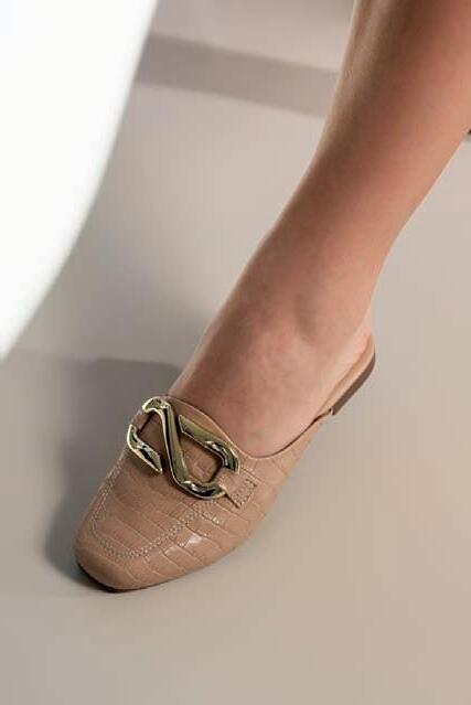 Mule, cabedal em PU com detalhe corrente dourada, forração em PU, palmilha em látex forrada em PU, solado laqueado, salto pintado 7 cm
