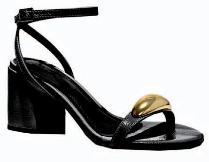 Sandália, cabedal em PU verniz e detalhe metalizado removível, forração em PU, palmilha em látex forrada em PU, solado laqueado, salto forrado em PU 10 cm