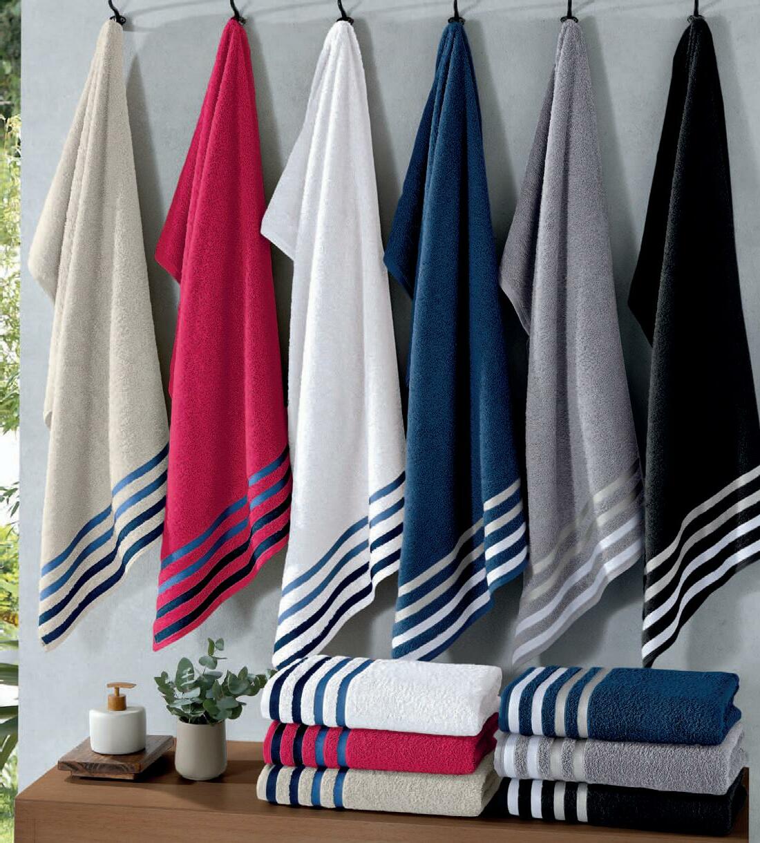 Jogo de toalhas em jacquard 2 peças 1 banho 0,70 x 1,40 m 1 rosto 50 x 70 cm Jogo de toalhas com barra em jacquard 2 peças 1 banho 0,70 x 1,40 m 1 rosto 50 x 70 cm Cor: 5513 azul ártiCo Cor: 228 salmão Cor: 136 amarelo Cor: 001 branCo Cor: 124 pérola Cor: 408 rosê Cor: 7286 verde lima Jogo de toalhas felpudas Composição: REF.: NICOLY100% algodão REF.: RAFAELA95% algodão, 5% poliéster na barra Imagens meramente ilustrativas. 460 g/m2 Ref.: Nicoly Ref.: R afaela Cor: 228 salmão Cor: 408 Âmbar 100% algodão Cod. 58940 4 X 34,90 Cod. 58945 4 X 34,90 BY BOutON Banho 172