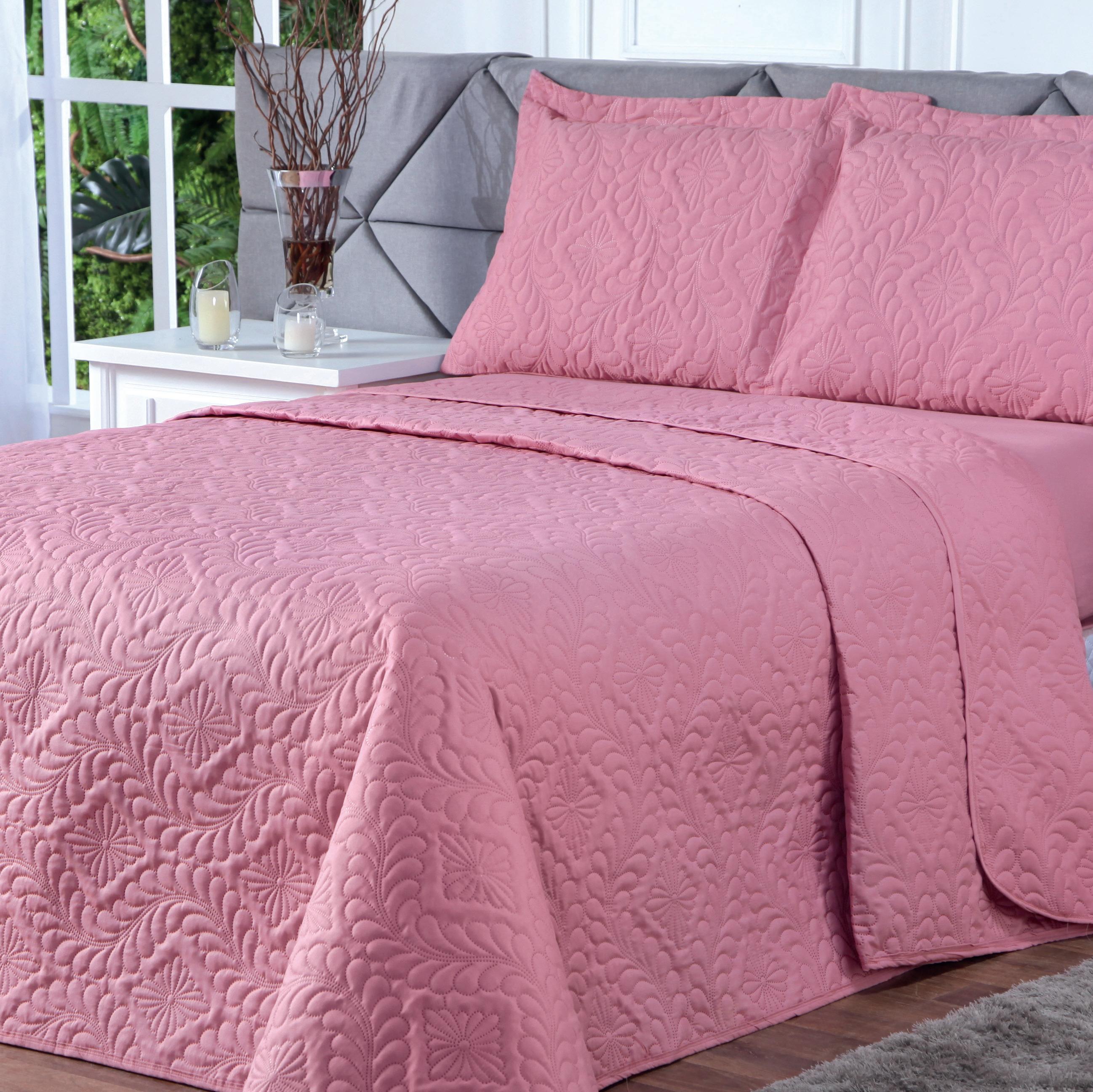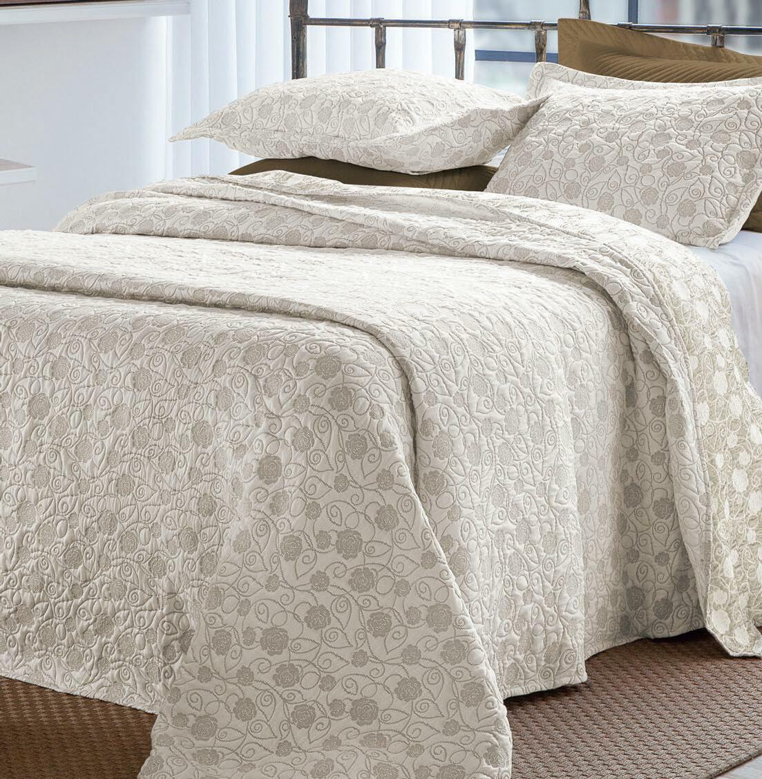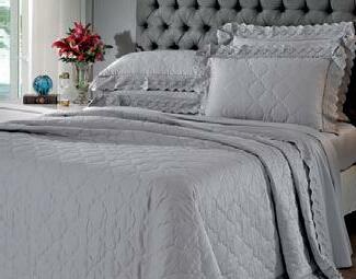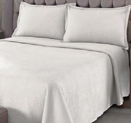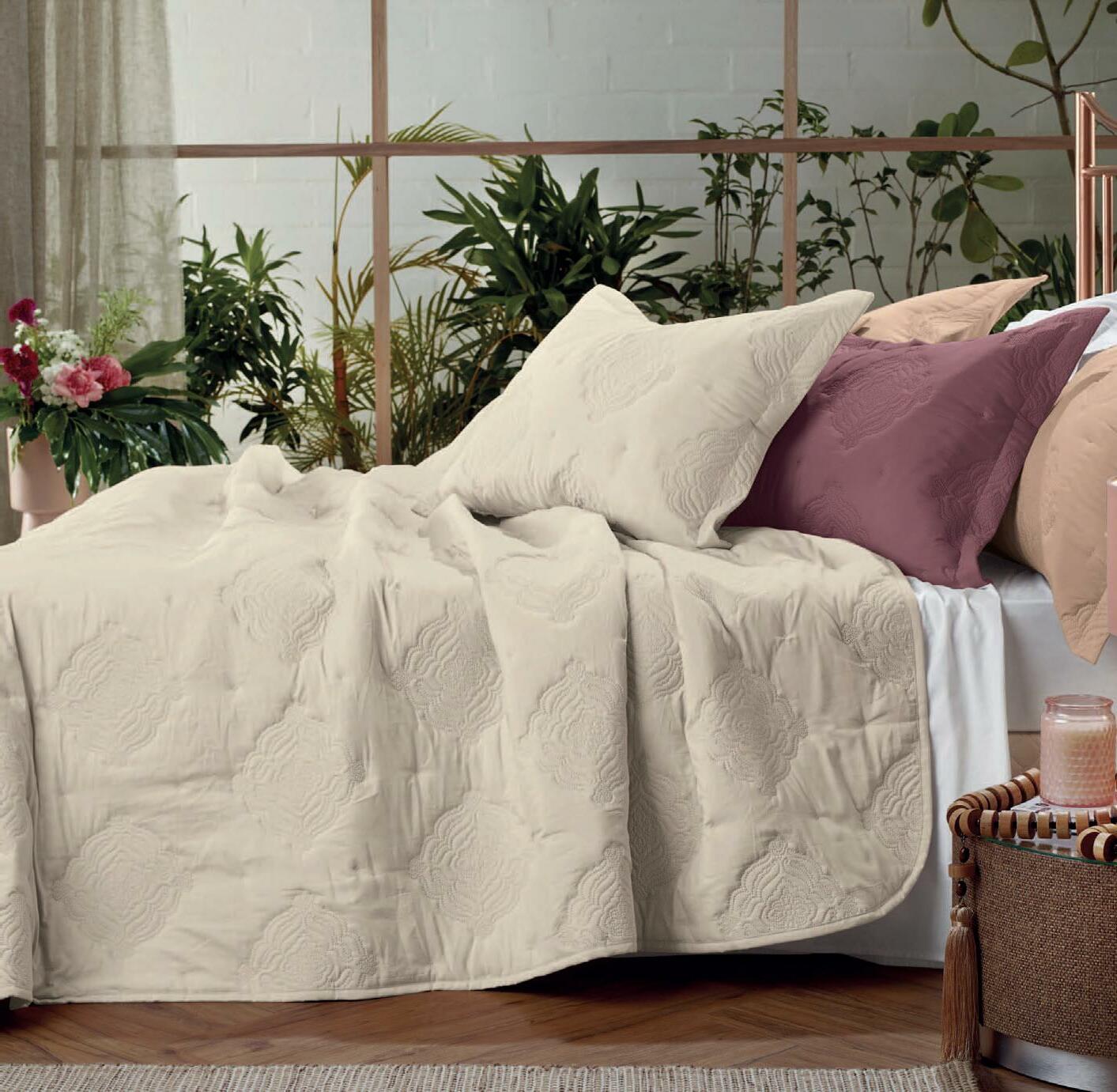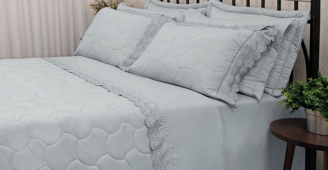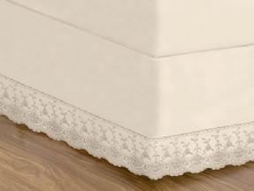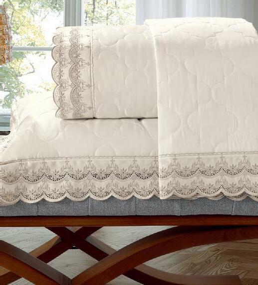 1 cobre-leito 2,50 x 2,80 m em renda na barra e lados 2 porta-travesseiros 50 x 70 cm com abas em renda