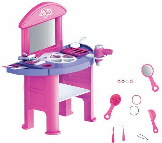 1 penteadeira, 1 secador, 1 babyliss, 1 espelho de mão, 1 escova, 1 tesoura, 1 pente, 1 lixa, 1 espátula, 1 pinça, 2 pulseiras, 4 anéis, 1 bandeja Tamanho montado: A 68 x L 30 x C 60 cm