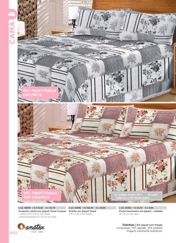 Colchas | Em piquet com franjas Composição: 70% algodão, 30% poliéster Imagens meramente ilustrativas. Conjunto colcha em piquet Casal 3 peças 1 colcha 2,20 x 2,40 m com franjas 2 porta-travesseiros 45 x 65 cm com abas Colcha em piquet Casal 2,20 x 2,40 m com franjas Porta-travesseiro em piquet - unidade 45 x 65 cm com abas os códigos abaixo sErv Em para todas as corEs dEsta página Ref.: Piquet fR anja CoR: Ref.:PRetoPiquet fR anja CoR: CaR amelo a Cort IneIra c od. 44060 r $ 162,40 4 x 40,60 c od. 44392 r $ 34,40 4 x 8,60c od. 44059 r $ 216,40 4 x 54,10002CAMA