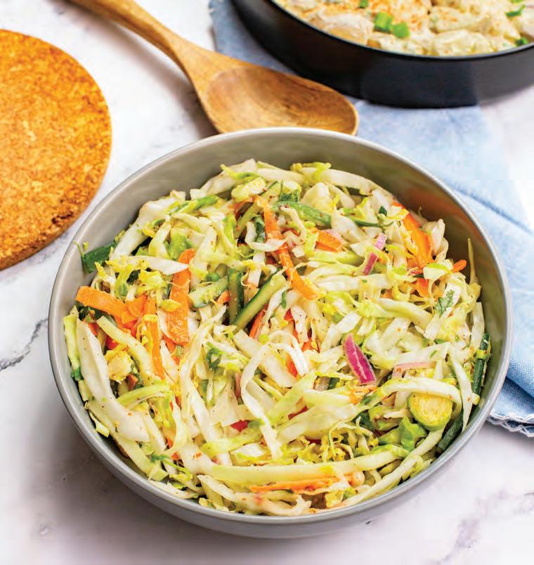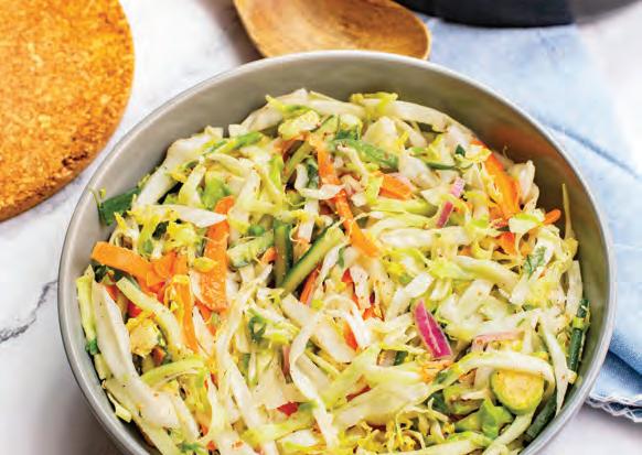 Start by thinly slicing your cabbage, you can buy pre-shredded if that’s easier, and add to a bowl. Follow suit with the rest of your veggies, make sure everything is thinly slicked, you can remove the seeds from the jalapeños to reduce the spice level. Add your veggies to a bowl while you prepare your dressing.