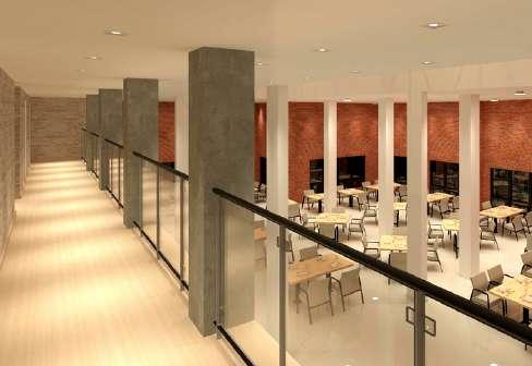 No 1º pavimento tem uma grande praça de alimentação, uma loja de livros e uma arquibancada de estar.