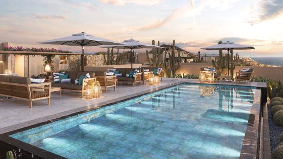 Uno de los requisitos clave fue diseñar una experiencia que se desplace sin interrupciones del exterior al interior, integrando terrazas, piscinas y decks que inviten a residentes y huéspedes a disfrutar del aire libre y aprovechar la cercanía al océano. Además, se buscó que el diseño de los espacios exteriores se integraran de manera natural con la playa, permitiendo un acceso directo sin necesidad de escalones. Gracias a las características topográficas de Cabo y a las etapas de crecimiento planificadas, se logró jugar con diferentes niveles, garantizando vistas al mar desde todas las habitaciones y logrando, al mismo tiempo, una integración armoniosa con el entorno.