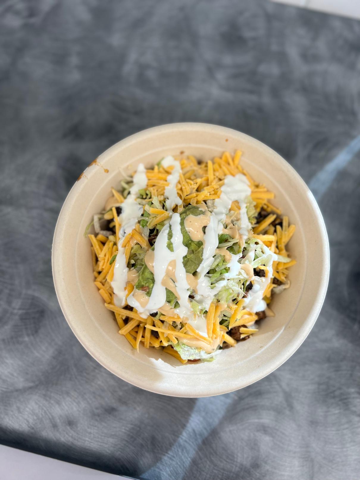 Our cuisine concept features build your own burrito bowls! We have spicy black beans and vegan chorizo for proteins. You can add an array of toppings to bulk out your bowl