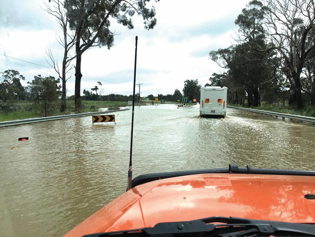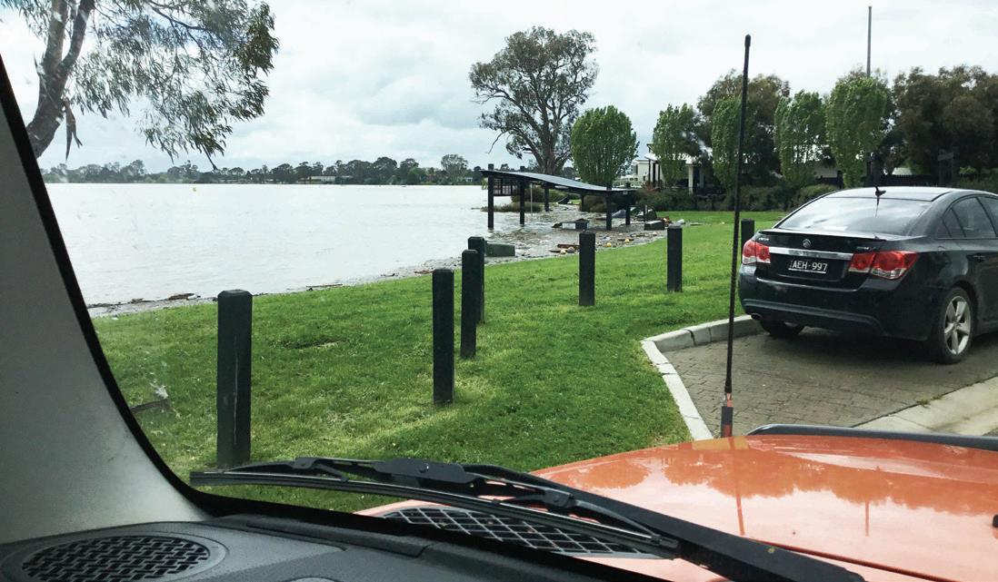 Whilst at the depot, the SES turned up. They had been hard at it since the early hours. I noticed the name tag, ‘Lloyd, Euroa’. Further inquiry revealed that Nagambie had no dedicated SES and relied on out of town support. Lloyd told me they were basing themselves at the CFA and were getting through the calls for assistance. I passed on the info regarding our sinking holiday house. It was next on their list to attend. I felt easier having spoken to the SES, they appeared ‘calm’ and organised, good to know. At home we sandbagged the neighbours front and back doorways. There is apparently an ‘art’ to sandbag placement and a quick look at the SES website gave us some good tips. On the next sandbag run, it appeared the CFA were having their own water issues, with the fore-court being pumped out. Where does that water go? Anyway, you have to protect the ‘Nerve Centre’ of the operation. The Stock Feed, Equine Store was doing a steady trade (in sand bags) when I joined the queue. Community spirit was high and we all pitched in to help load the vehicles and trailers. CFA were supervising at this point. The bags weren’t getting any lighter, they weighed a tonne! No need for a gym workout today. The short trip home saw continuing steady rain and ever expanding gutters, with the side roads adjacent to High Street, slowly disappearing. Now the best advice probably, was to stay off the roads and manage the water levels at home. But the better half was curious and requested a tour of the district. The Weir was well-up. Normally a thirty or forty metre drop to water level, it was up over the gate-release openings and really going hard. Kirwans Bridge was next on the list and doubt arose about it being crossable? Hardly an issue, plenty of clearance, but I stuck to below the 20k speed limit. Reedy Road out the other side was a challenge, water on, or covering most of the road, back into town. The drive back saw the service roads threatening High Street, with rain still steady. The neighbour, who has Iived here for 35 years, reckons it’s the highest he’s seen it. Friends out on Wattlevale Road, had the burst river claim about 200 acres of paddocks. The river came up 300 metres to their levy bank, within 20 metres of the house.