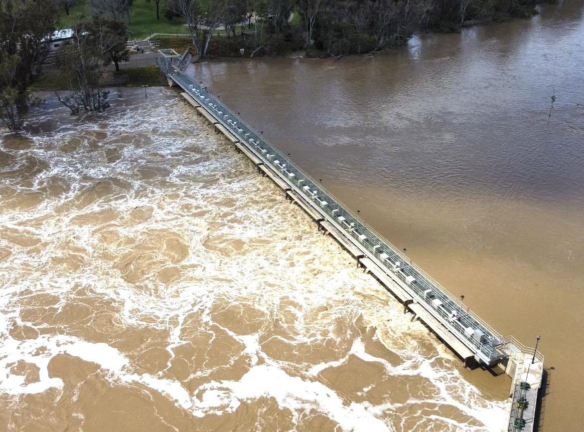 The historic Goulburn Weir experienced increased visitation as hundreds came to see all gates open and water powering downstream. The sign post marking the height of the 1974 floods was not visible when the river peaked.
