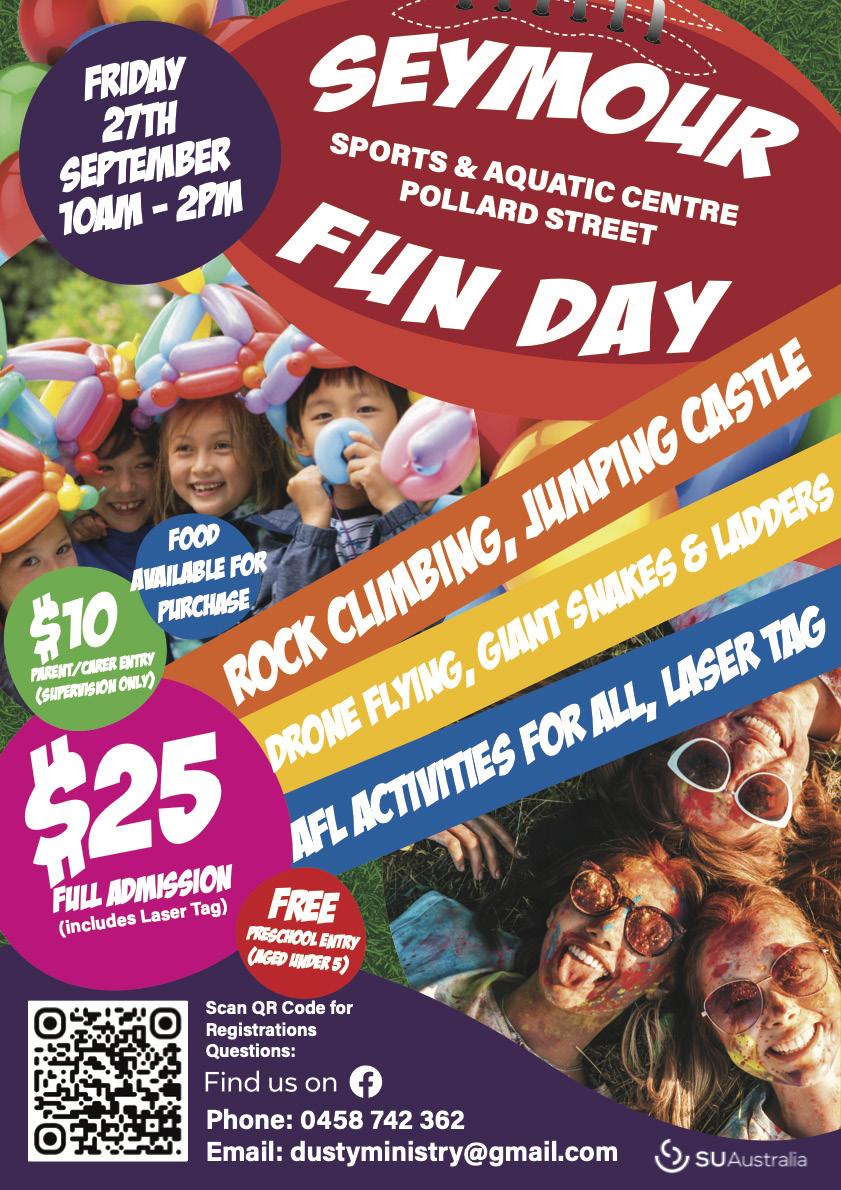 The committee of the Seymour Fun Centre are excited to announce our second Seymour Fun Day is happening on Friday the 27th of September 2024, aka AFL Grand Final Eve. The day will include everything from Rock Climbing through to Drone Flying.