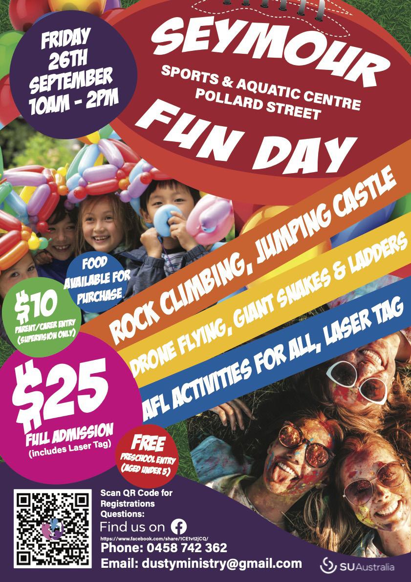The commitee of the Seymour Fun Centre are excited to announce our third Seymour Fun Day is happening on Friday the 26th of September 2025, aka AFL Grand Final Eve. The day will include everything from Rock Climbing for the adventurous to craft for the hands on.