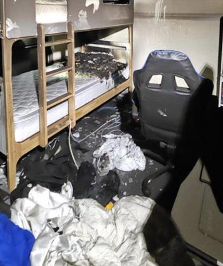 “I was alerted by my son yelling and screaming because he got burnt from debris falling from the top of the bunk. He woke us up by saying there was fire on his bed,” Jessica said.