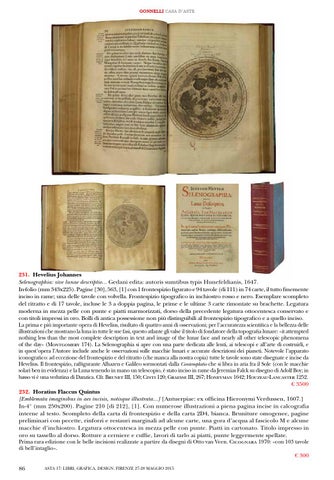 231. Hevelius Johannes Selenographia: sive lunae descriptio... Gedani edita: autoris sumtibus typis Hunefeldianis, 1647. In-folio (mm 343x225). Pagine [30], 563, [1] con 1 frontespizio figurato e 94 tavole (di 111) in 74 carte, il tutto finemente inciso in rame; una delle tavole con volvella. Frontespizio tipografico in inchiostro rosso e nero. Esemplare scompleto del ritratto e di 17 tavole, incluse le 3 a doppia pagina, le prime e le ultime 3 carte rimontate su brachette. Legatura moderna in mezza pelle con punte e piatti marmorizzati, dorso della precedente legatura ottocentesca conservato e con titoli impressi in oro. Bolli di antica possessione non più distinguibili al frontespizio tipografico e a quello inciso. La prima e più importante opera di Hevelius, risultato di quattro anni di osservazioni; per l’accuratezza scientifica e la bellezza delle illustrazioni che mostrano la luna in tutte le sue fasi, questo atlante gli valse il titolo di fondatore della topografia lunare: «it attempted nothing less than the most complete description in text and image of the lunar face and nearly all other telescopic phenomena of the day» (Montgomery 174). La Selenographia si apre con una parte dedicata alle lenti, ai telescopi e all’arte di costruirli, e in quest’opera l’Autore include anche le osservazioni sulle macchie lunari e accurate descrizioni dei pianeti. Notevole l’apparato iconografico: ad eccezione del frontespizio e del ritratto (che manca alla nostra copia) tutte le tavole sono state disegnate e incise da Hevelius. Il frontespizio, raffigurante Alhazen e Galileo sormontati dalla Contemplatio che si libra in aria fra il Sole (con le macchie solari ben in evidenza) e la Luna tenendo in mano un telescopio, è stato inciso in rame da Jeremias Falck su disegno di Adolf Boy; in basso vi è una vedutina di Danzica. Cfr. Brunet III, 150; Cinti 120; Graesse III, 267; Honeyman 1642; Houzeau-Lancaster 1252.