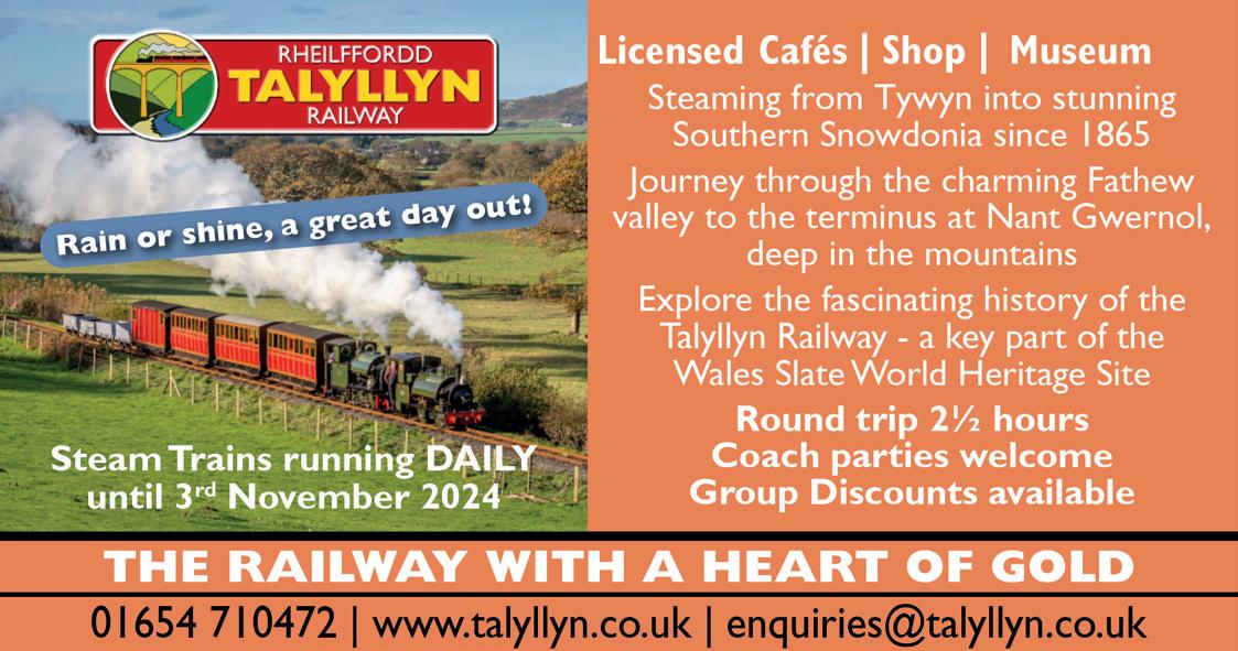 Book at www.KingArthur.Wales 01654 761584 corris Wrecsam, LL13 8AE Xplore! Cartref Gwyddoniaeth Wych Archebwch eich tocynnau rŵan Xplore! is Where Science comes to Life Book your tickets now! 20% off your tickets using code NorthWalesXP23 20% ostyngiad ar docynnau gyda côd NorthWalesXP23 01978 293400 Artwork 24.10.23 copy.pdf 1 25/10/2023 13:33:26 Nature beckons Step into a wild wetland, sculpted from mud and bursting with wildlife, from wading birds to warblers. Enjoy scenic trails, a tasty coffee shop and a vibrant playground. Plan your visit today Conwy The RSPB is a registered charity in England & Wales 207076, in Scotland SC037654. Image by Sara Porter (rspb images.com) rspb.org.uk/conwy Great Orme Bronze Age Mines Visit Llandudno’s world famous Bronze Age mine. Visitor Centre, introductory film, underground tour, amazing 3,500 year old cavern, 4,000 year old opencast, smelting display and viewing areas. A true wonder of the ancient world. Located in the stunning Great Orme country park. Follow the ancient mine signs from Llandudno. Open Mid March – Late October Time 9.30am – Last entry 4.30pm Admission Check website for admission prices Great Orme, Llandudno, Conwy, LL30 2XG Phone 01492 870447 www.greatormemines.info Open 7 days a week Book online or call 01492 701530 SHOP TOURS MASTERCLASSES www.penderyn.wales/llandudno FFESTINIOG & WELSH HIGHLAND RAILWAYS Steaming through the heart of Eryri (Snowdonia), these two railways offer a variety of scenic train ride opportunities Enjoy a relaxing, steam-hauled ride through magnificent scenery, with time to explore your destination before the return journey. Most journeys start from one of our main stations in Caernarfon, Porthmadog or Blaenau Ffestiniog Our website provides detailed information on our half-day or full-day options, with useful information to help plan your visit. Advanced booking is strongly recommended Open Late March to early November plus limited winter opening. Times: Please see website for train times and journey ideas. Harbour Station, Porthmadog, Gwynedd, LL49 9NF Phone: 01766 516024 www.festrail.co.uk Victoria Station, Church Walks, Llandudno, LL30 2NB 01492 577 877 tramwayenquiries@conwy.gov.uk www.greatormetramway.co.uk Llandudno's unique heritage attraction Since 1902 Open throughout summer Stunning views Historical engineering Family & group discounts Every 20 minutes Dogs welcome The 1950’s Museum Take a trip back in time inside our unique museum. Thousands of artefacts that tell a story of how Britain lived in the post-war austerity years. From cigarette packets, classic cars, radios, vinyl records, room-settings, a crime section with the original Great Train Robbery vehicle to clothing, household gadgets, children’s annuals and toys to many other items that can be touched. We can guarantee a memorable visit. Open All year except Christmas Day Time Open daily 11am 4pm (Groups Welcome) Admission Adults £7.50 Child (4-14yrs) £4.00 Under 4 yrs Free/ Family/ Guardian Ticket: 2 Adults and 2 Children £20 Cae Dai The Lawnt Denbigh LL16 4SU (On road to Nantglyn B4501) Tel 01745 817004 Pet Friendly Denbigh 23 Sygun Coppermine Sygun offers those with a sense of adventure & curiosity an opportunity to discover the wonders of an historic copper mine. Enjoy a self- guided audio- visual tour allowing you to explore the old workings of a Victorian Copper Mine. Discover the colourful chambers, see the magnificent stalactite and stalagmite formations. There is also a great deal to see and do on the surface: Museum of Antiquities • Gold Panning • Metal Detecting Adventure Playground • Lakeside Walks A real adventure for all ages whatever the weather Beddgelert Gwynedd LL55 4NE Visit www.syguncoppermine.co.uk Tel 01766 549795 Beddgelert 10 Crazy Golf & Locked In Brand New 12 Hole Castle Themed Crazy Golf In Towyn. Come and play 12 fun holes of golfing fun! Plus 2 Locked In Brand new escape rooms including Mad Hatter. Also Locked In Has 4 Escape rooms in Abergele. Live escape team building activities involve a team of friends or colleagues trying to escape out of a locked room by solving various puzzles, riddles and all sorts of hints and codes. Can you escape in one hour? Perfect for all ages. Packages available when booking Golf & Escape Rooms. Check our facebook page for opening times The Old School House Towyn Rhyl Denbighshire LL22 9ER Visit lockedin-northwales.com Tel 01745 798670 @crazygolftowyn Follow on facebook for up to date us date Towyn 26 Llyn Brenig Llyn Brenig is enjoyed by many fishermen and recreational boat users, along with watersports enthusiasts. Paddleboards and kayaks are available to hire during the summer months and self-launch is also available (t’s & c’s apply). The visitor centre has a gift shop, osprey exhibition and an activity hire area with fishing supplies. Caffi Brenig is open every day serving a delicious menu. Our walk and cycle trails vary from 4 - 15km, and bike hire is available for all the family. Kids will love the adventure playground with zip wire! Summer: Mid-Mar to Oct 8am - 5pm (gates close 5pm) Winter: Nov to Mid-Mar 8am - 4pm (gates close 3.45pm) Closed 25/26 December Parking £3.00 all day Cerrigydrudion Corwen Conwy LL21 9TT Visit llyn-brenig.co.uk Cerrigydrudion 24 Llandudno Snowsports Centre Skiing, snowboarding, sno-tubing, tobogganing, crazy golf, alpine bar & kitchen Enjoy amazing panoramic views of Llandudno Great facilities and fantastic package offers Fantastic fun for all the family with plenty of free parking Find us up Happy Valley on the Great Orme Call now on 01492 874707 See website for activity prices Wyddfyd Road Llandudno Conwy LL30 2LR Visit www.jnllandudno.co.uk Llandudno 30 Bala Lake Railway Llanuwchllyn – Bala LL23 7DD Steam trains through Southern Snowdonia Book online – save £££ Visit bala lake railway.co.uk Snowdon Mountain Railway Take a once in a lifetime adventure on the Snowdon Mountain Railway, which has been describe