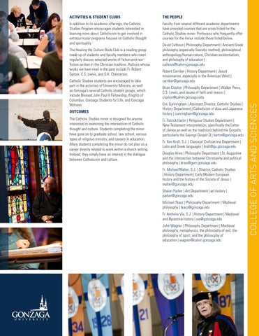 Catholic Studies students are encouraged to take part in the activities of University Ministry, as well as Gonzaga’s several Catholic student groups, which include Blessed John Paul II Fellowship, Knights of Columbus, Gonzaga Students for Life, and Gonzaga Witness. OUTCOMES The Catholic Studies minor is designed for anyone interested in examining the intersection of Catholic thought and culture. Students completing the minor have gone on to graduate school, law school, various types of religious ministry, and careers in education. Many students completing the minor do not plan on a career directly related to work within a church setting. Instead, they simply have an interest in the dialogue between Catholicism and culture.