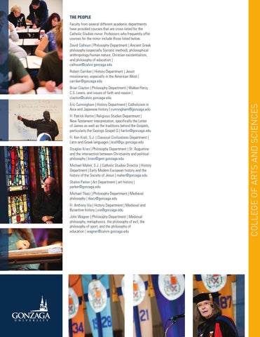 THE PEOPLE Faculty from several different academic departments have provided courses that are cross-listed for the Catholic Studies minor. Professors who frequently offer courses for the minor include those listed below. David Calhoun | Philosophy Department | Ancient Greek philosophy (especially Socratic method), philosophical anthropology/human nature, Christian existentialism, and philosophy of education | calhoun@calvin.gonzaga.edu Robert Carriker | History Department | Jesuit missionaries, especially in the American West | carriker@gonzaga.edu