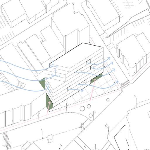 A diagram of energy strategies employed in the average room demonstrates the building’s preparedness for year-round weather changes, The structural render modeled on Revit reveals the intracties in the interior of the prism.