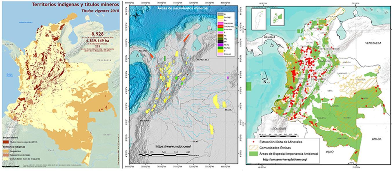 Portada: Colombia: Territorios indígenas V.S. Títulos mineros; Zonas de yacimientos mineros; y Minería ilegal V.S. Áreas de interés ambiental. Contraportada: Valle de Cocora – Salento, Quindío.