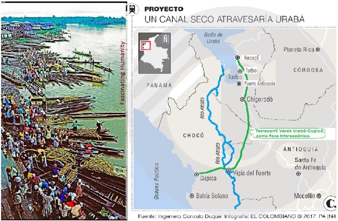 La navegación por el Atrato: ésta es la hidrovía para llevar el desarrollo al interior del Chocó, y no el camino para expoliar su riqueza. Colombia debe pensar en un ferrocarril interoceánico entre Urabá y Cupica, complementado con la hidrovía del Atrato.