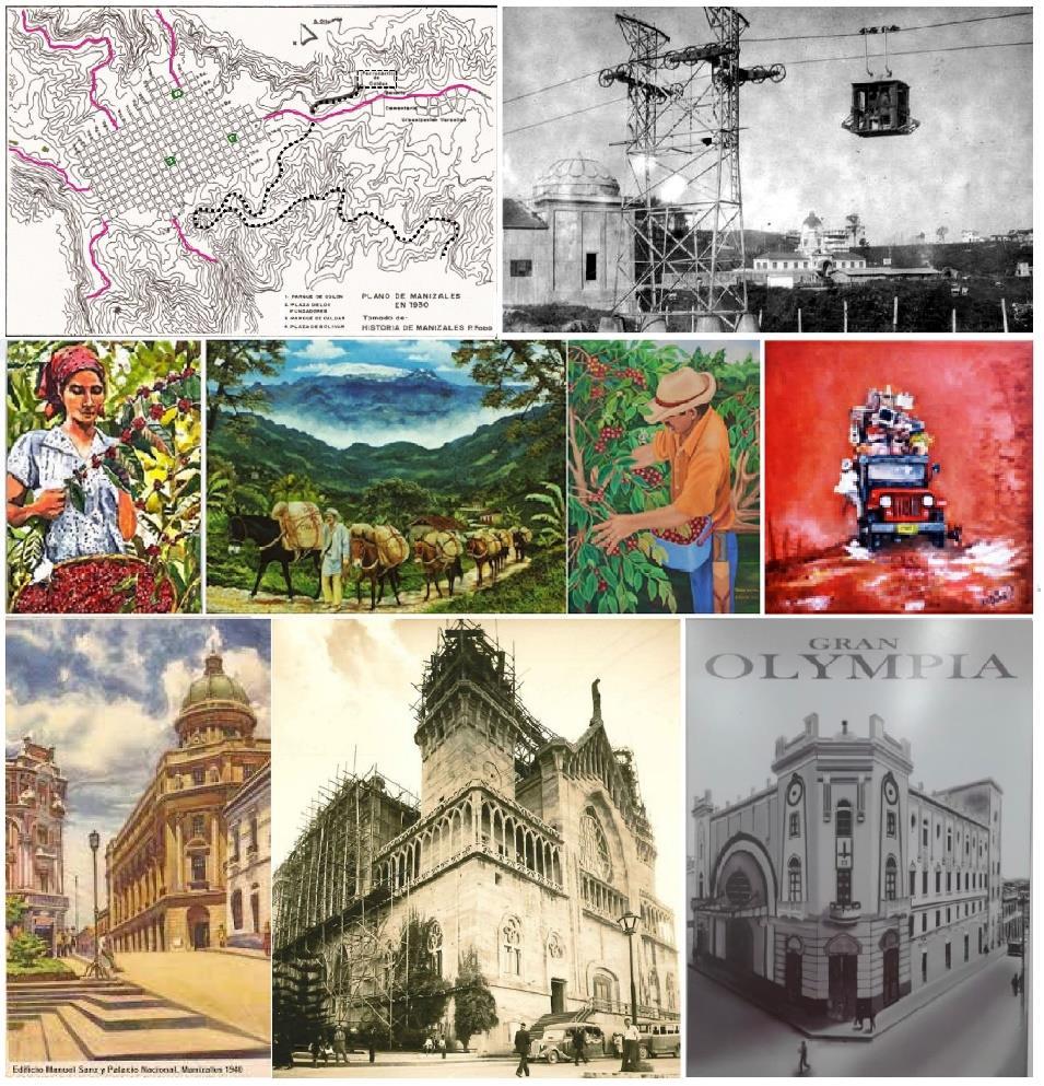 Manizales años 30: Plano de la ciudad en Historia del P. Fabo, Cable a Aranzazu (19291940), PCC (varios artistas), Centro Histórico, nueva Catedral de Manizales en 1935 y Teatro Gran Olympia (1930). Fuente: C. H. de Manizales