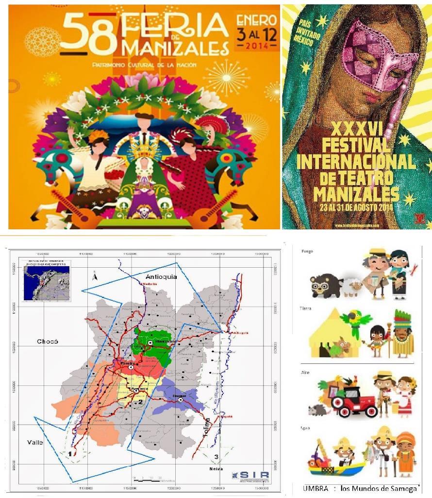 Manizales- La Feria y el Festival de Teatro. (Alc. de Manizales) ; Conurbaciones de la Ecorregión Cafetera (SIR), e íconos de identidad regional en Mundos de Samoga ( U. N. de C.).