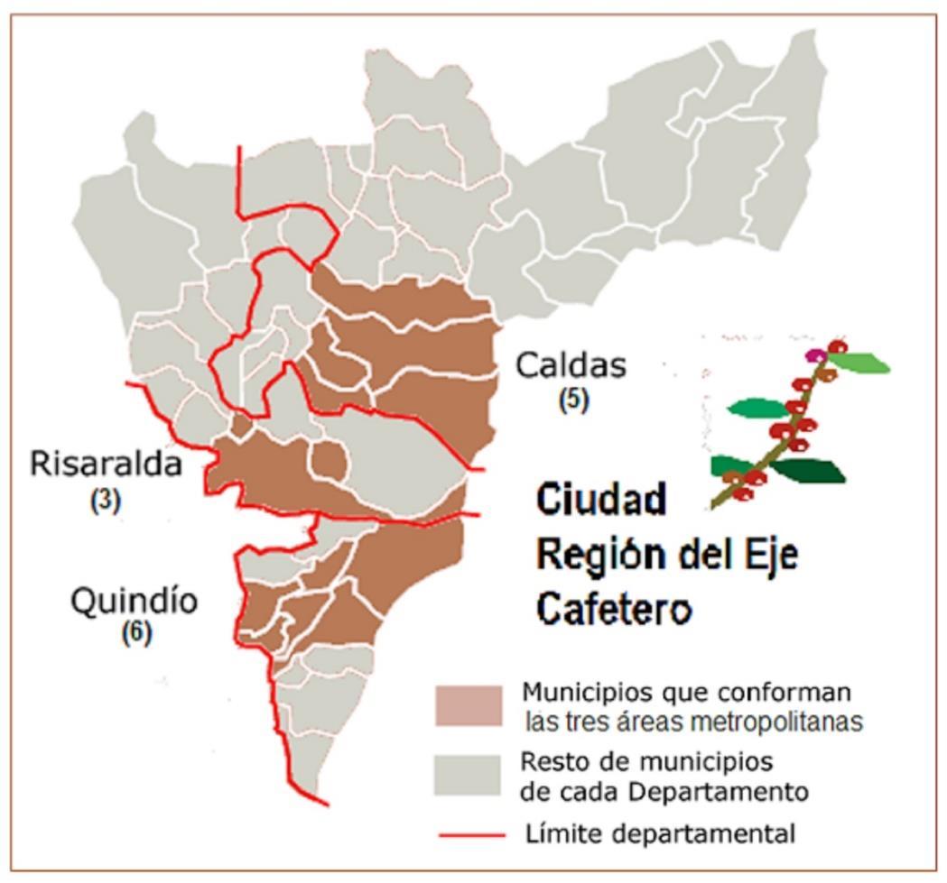 Ciudad Región del Eje Cafetero, con las potenciales áreas metropolitanas de Caldas, Risaralda y Quindío en Mapa de Wikipedia adaptado.