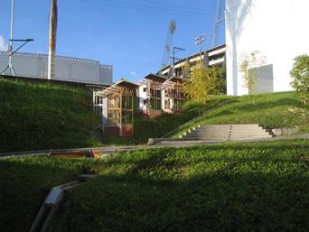 • A continuación, y empezando a simular un ambiente urbano típico de nuestras ciudades andinas de alta montaña, se encuentra un modelo de tratamiento de taludes con terrazas o bancas (abancalamiento), que incluye terrazas en concreto y en geomembrana, con cunetas interiores de sección recta trapezoidal que recogen el agua de escorrentía de los taludes y las conducen hasta los columpios (coincidentes con las terrazas) de la estructura de vertimiento descrita atrás (C.R.T.C.). Los taludes entre terrazas aparecen tratados superficialmente con distintos sistemas de cobertura vegetal (empradizados, especies nativas como el maní forrajero, etc.).