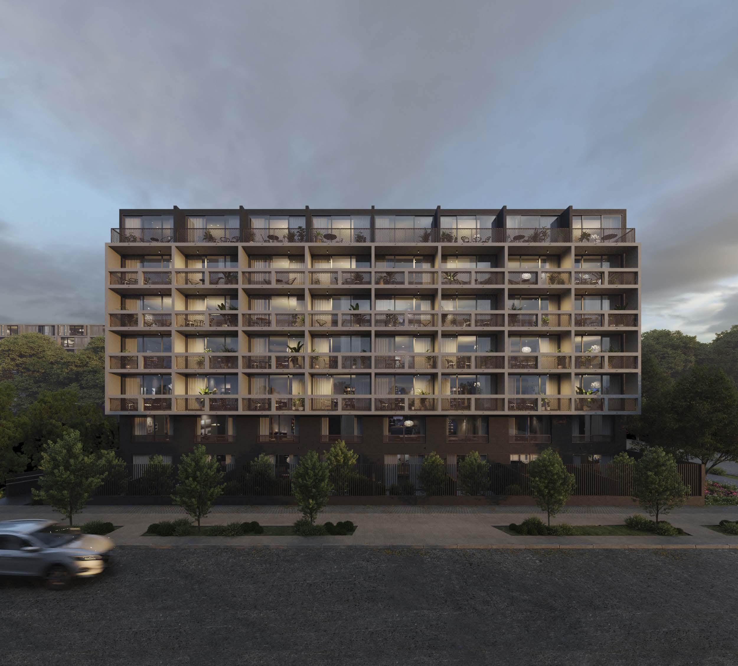 La fachada se completa con barandas altas y opacas además de barandas color cobre que forman un lenguaje arquitectónico uniforme dando un estilo único y carácter al proyecto.