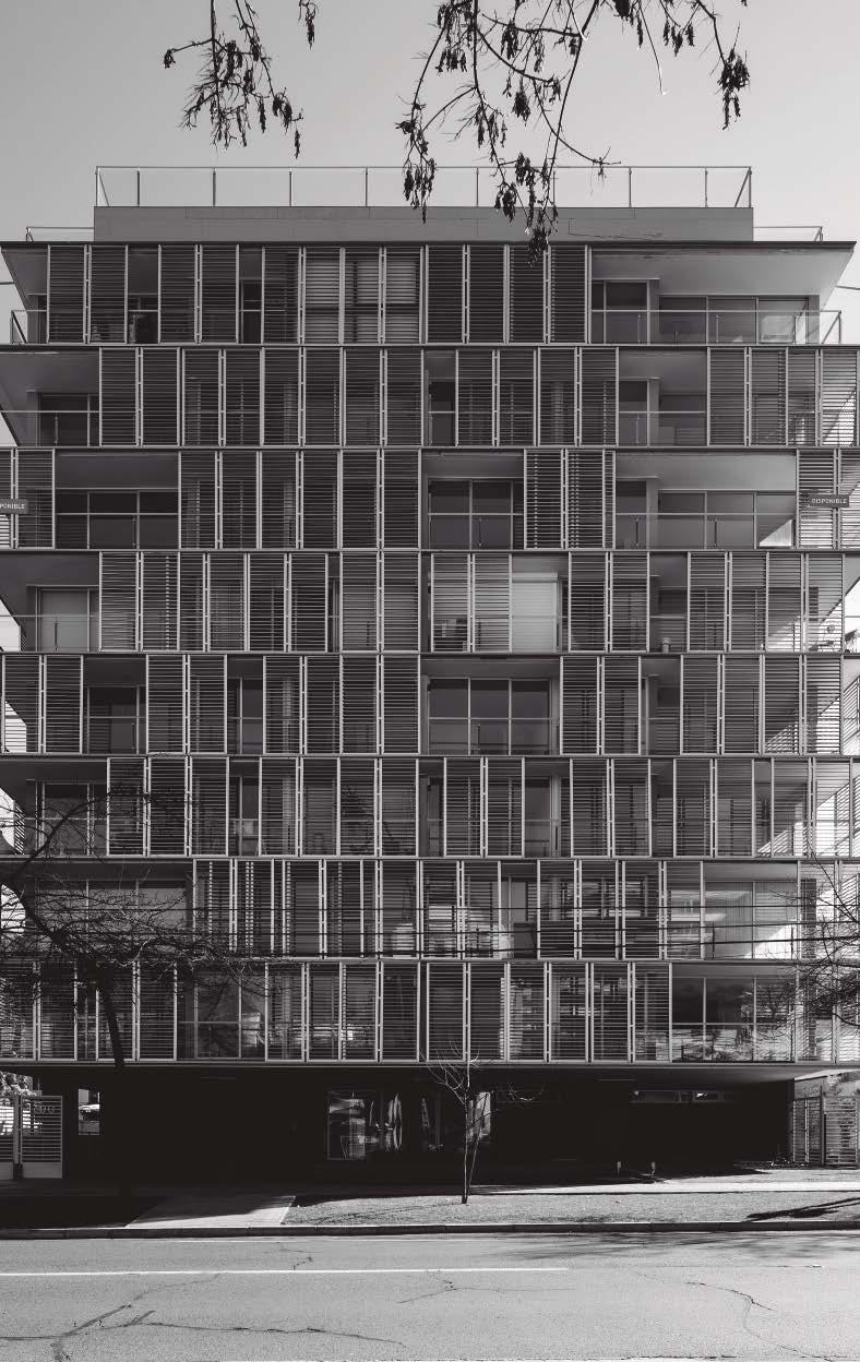 Hacia ambas calles el edificio se diseñó con una fachada regular de volúmenes que marcan cada unidad.