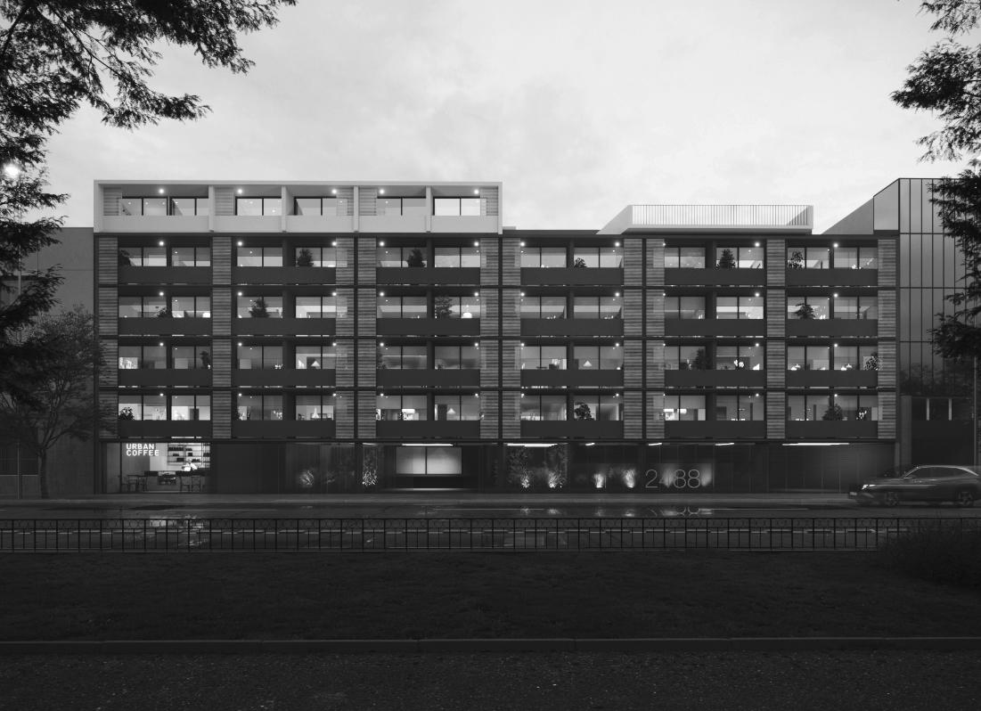 Posee departamentos de uno y dos ambientes con cocinas incorporadas y en su mayoría con terrazas, en promedio entre los 23 y 32 m2 aprox. Se proyectan dos pisos subterráneos para estacionamientos de autos y bicicletas, más salas de servicio y lavandería.