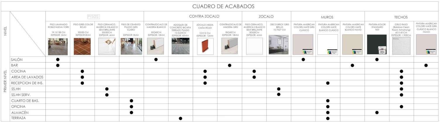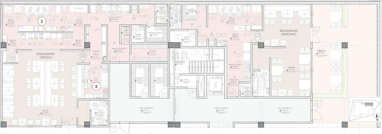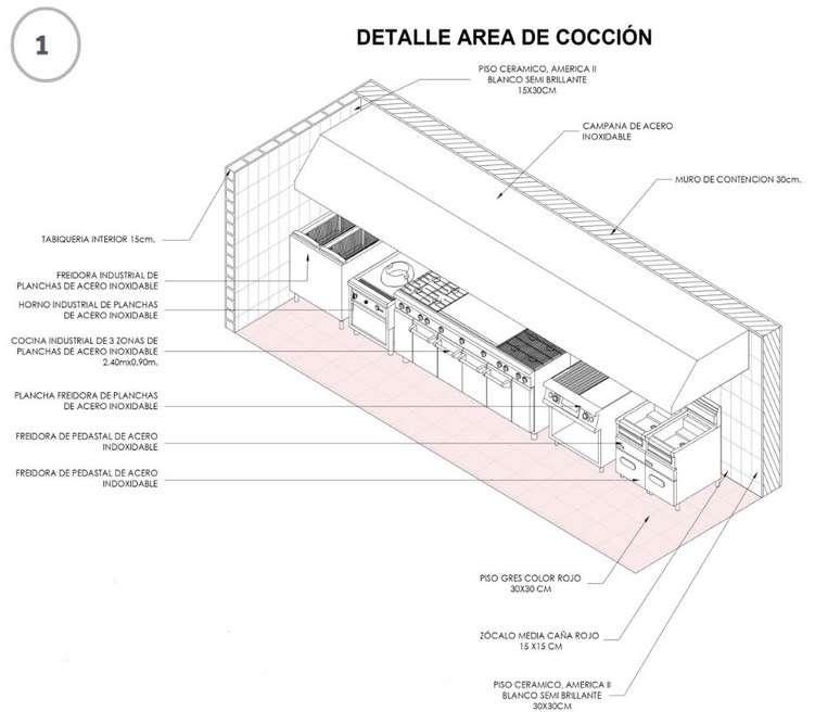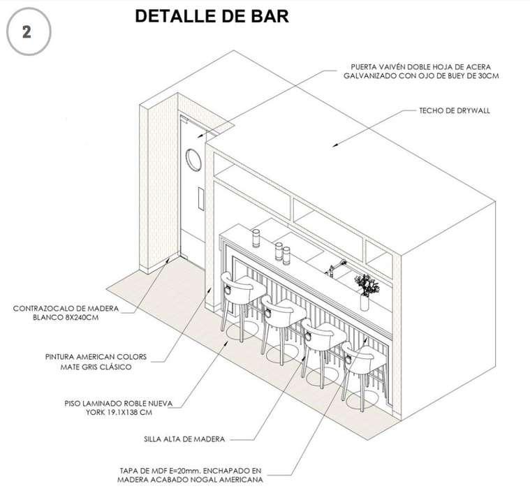 Planta a detalle de un restaurante, con detalle del bar, cocina y materiales correspondientes.