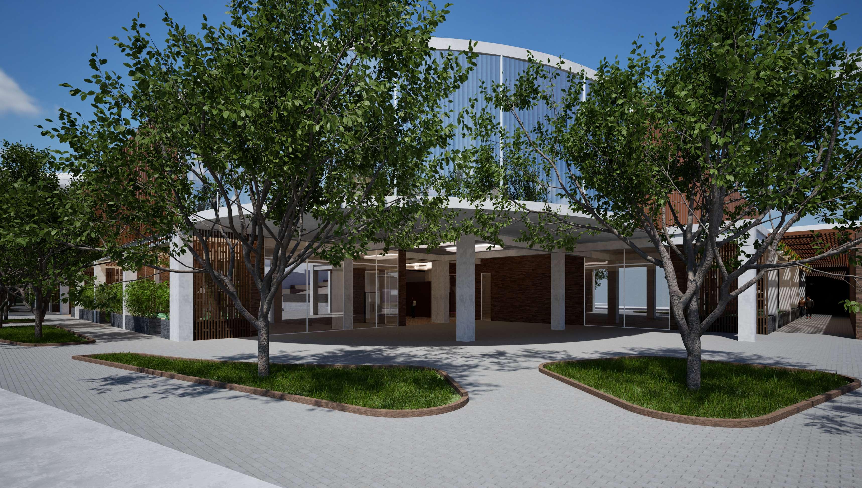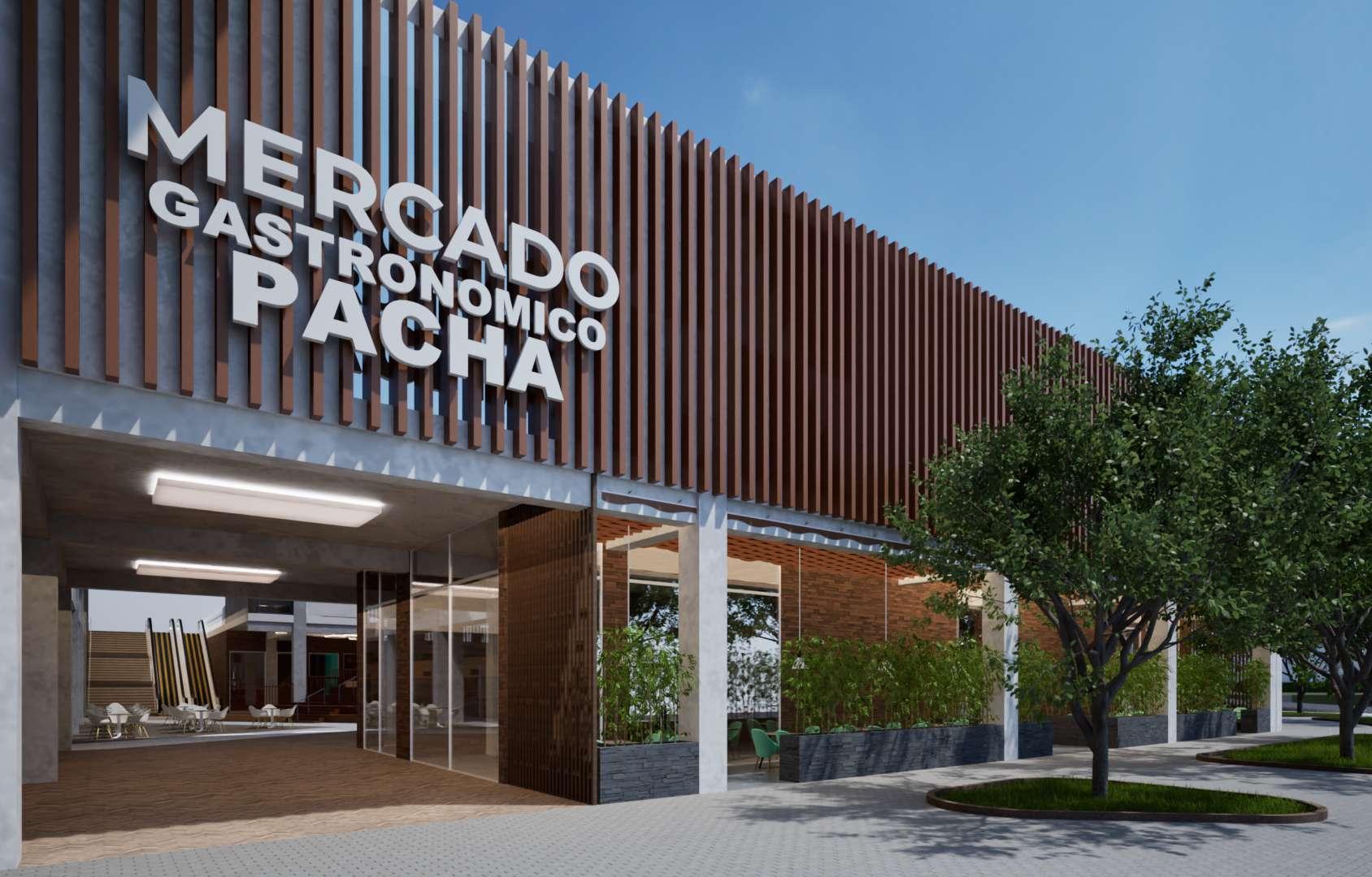 Mercado Gastronómico con fachada en celosías de madera y vidrio, estructura de concreto y areas verdes al exterior.