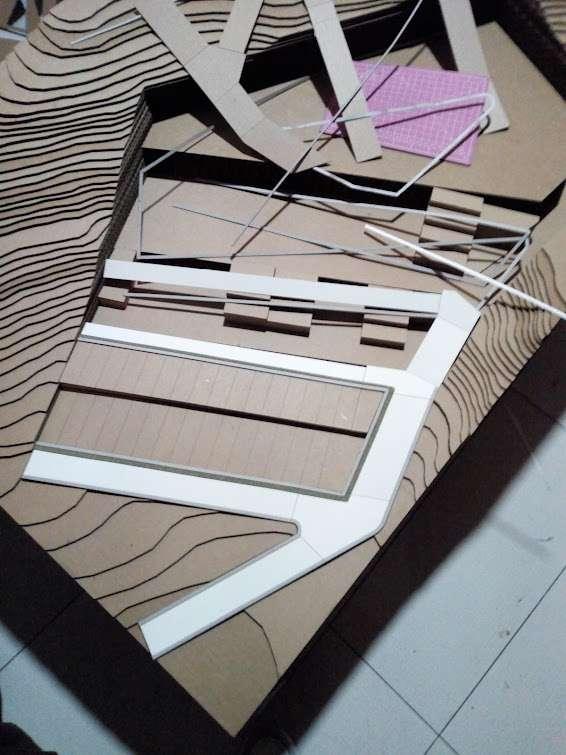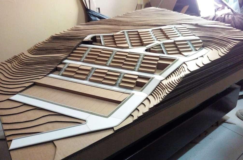 Se realizo la la maqueta con cartón corrugado, micro corrugado, cartón maqueta, cartulina, arboles y mobiliarios a escala, cobertura de acrílico.
