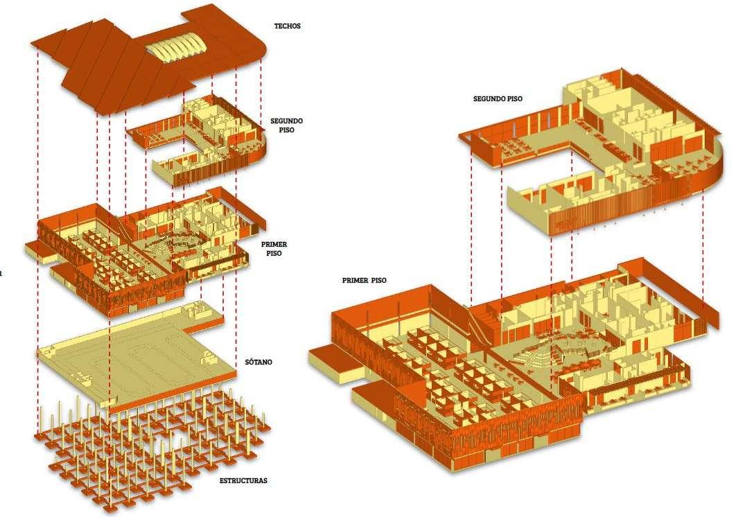 Planta explotada por nivel y su estructura, del Centro Gastronómico.