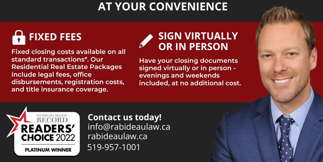 HEAD OFFICE 275 Lancaster St. W., 2nd Floor Kitchener, Ontario N2H 4V2 CAMBRIDGE OFFICE 140 McGovern Dr., Suite 8 Cambridge, Ontario N3H 4R7 YOUR Real Estate Law Firm What Victor Provides • Unmatched exceptional service • Direct access to 2 Lawyers • A pre-set guaranteed account • 16 experienced, professional and knowledgeable Clerks • Real Estate with complete peace of mind Email Victor Hussein for a free quote at victor@vhlaw.ca 519 744 8585 WWW.VHLAW.CA Real Estate Law...it’s ALL we do! Voted Favourite REAL ESTATE LAWYER REAL ESTATE LAW FIRM