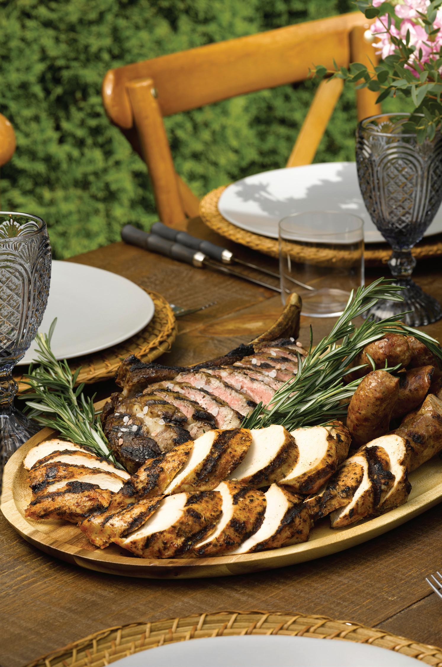 For the main courses, we recommend offering lots of variety, with mixed platters of chicken, steak, and sausage complemented by healthy side dishes like grilled portobello mushroom caps with Chèvre cheese and simply grilled asparagus. All these sides can be cooked on the grill, but if you find you're getting short on space, they can also be cooked in the oven or on the range in the kitchen.