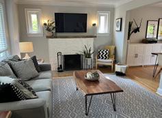 The Living Room presents soaring ceilings, gleaming hardwoods, a gas fireplace with stone surround, loads of natural light pouring in from the windows across the back of the room and the skylights above.