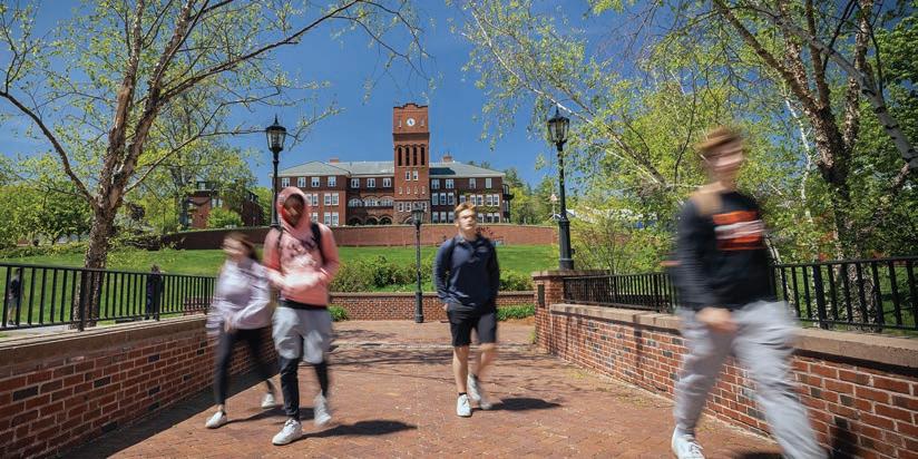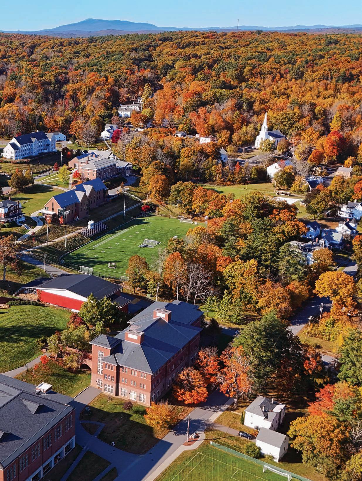 Amid the splendor of a New England fall, this aerial view of campus includes the new Sawyer-Hopkins Hall and Lemieux Family Wellness Center — highlighting a campus transformed. Read more on the following pages.