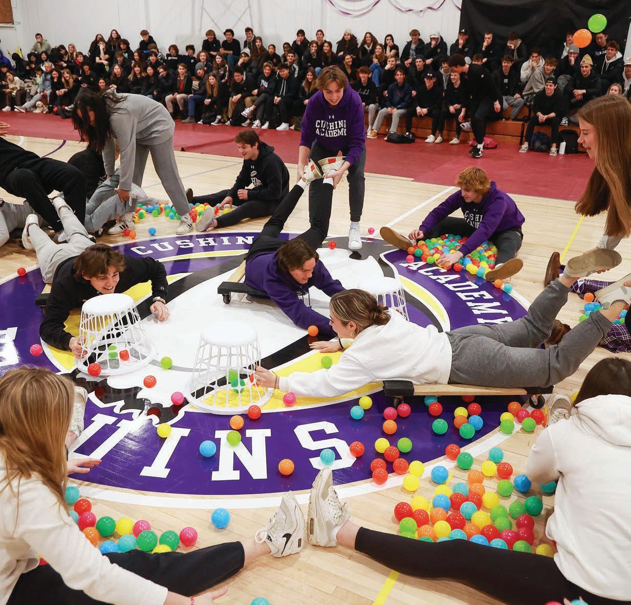 During a Winter Pep Rally, Cushing students participate in a life-sized game of Hungry Hungry Hippos in Heslin Gymnasium.