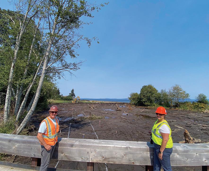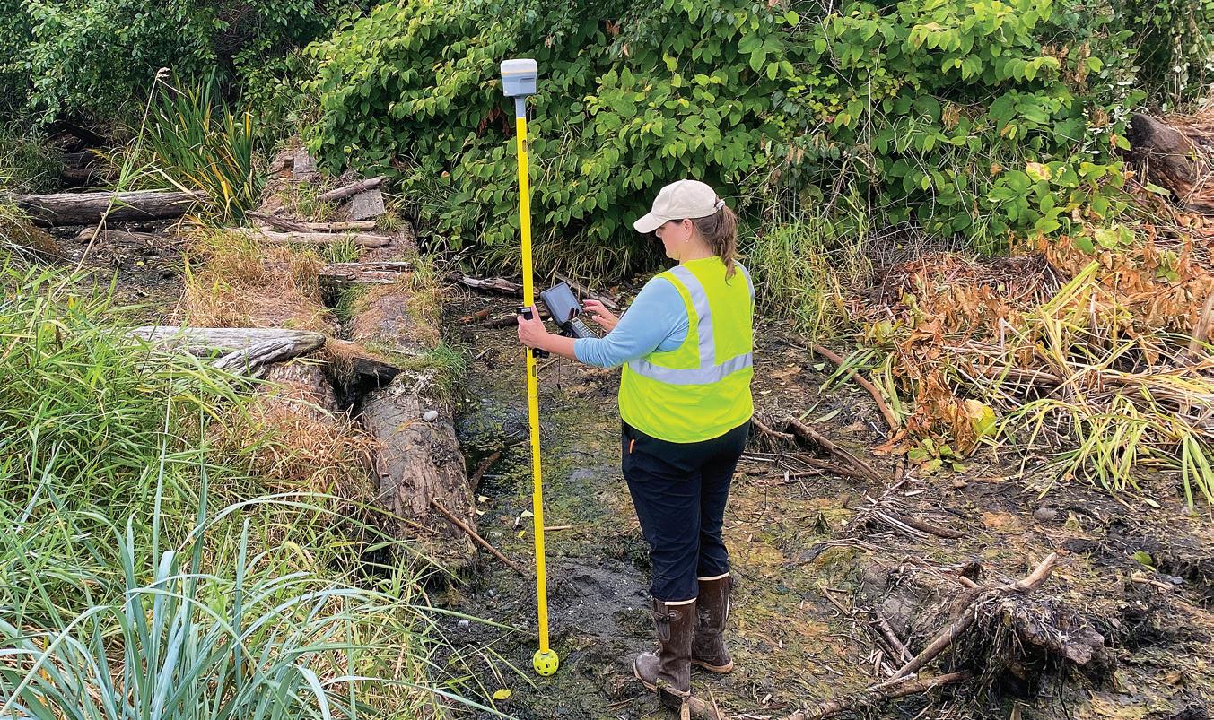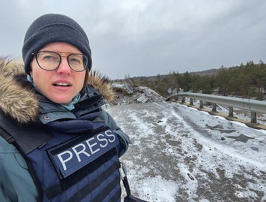 Opposite page: Susannah Walden ’06 next to a destroyed bridge in Donetsk, Ukraine, after reporting on a Ukrainian tank brigade