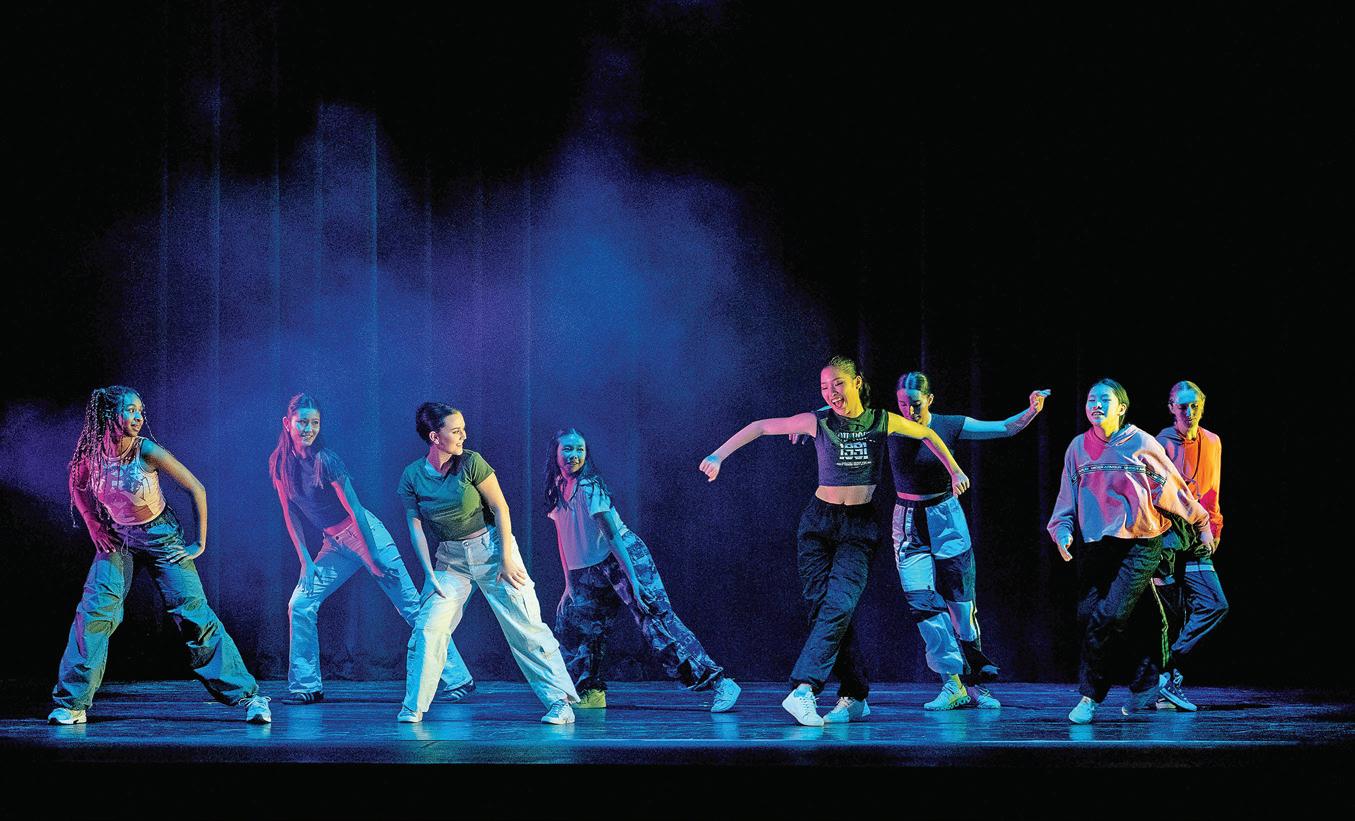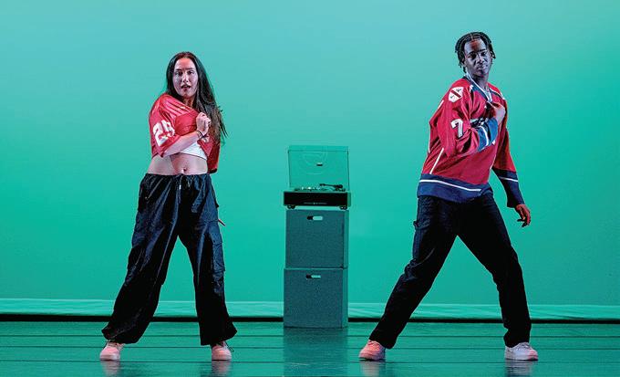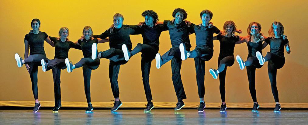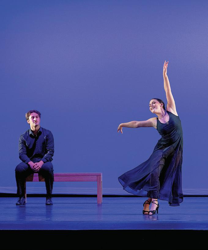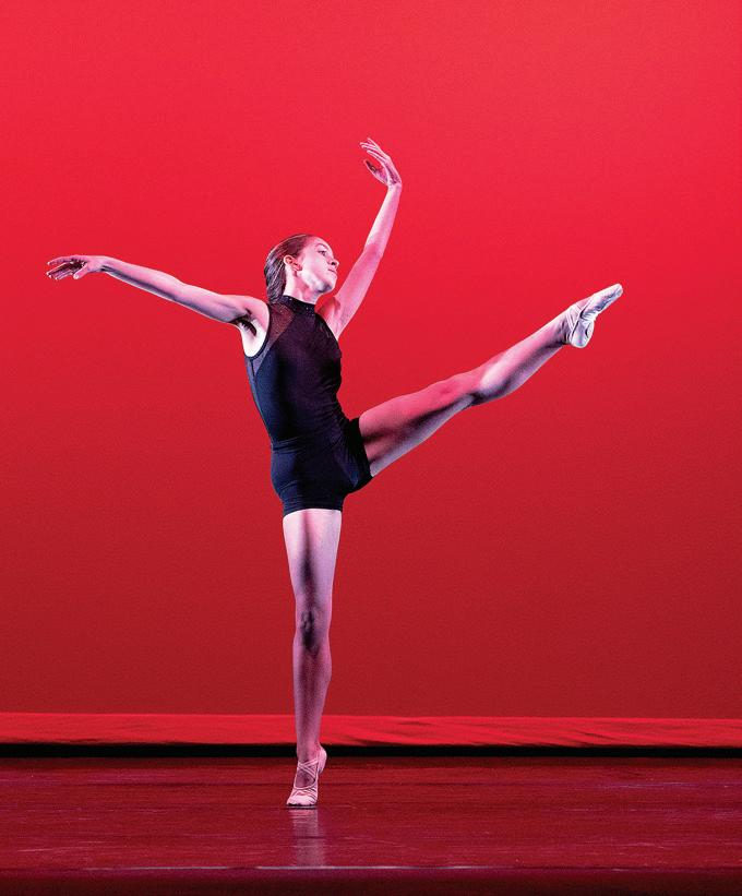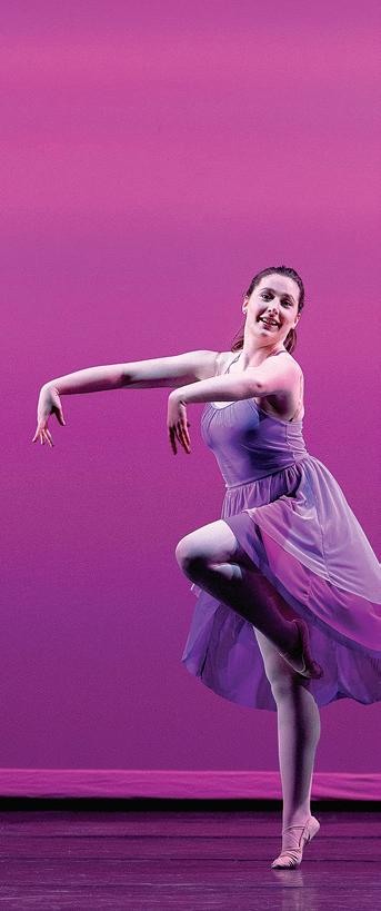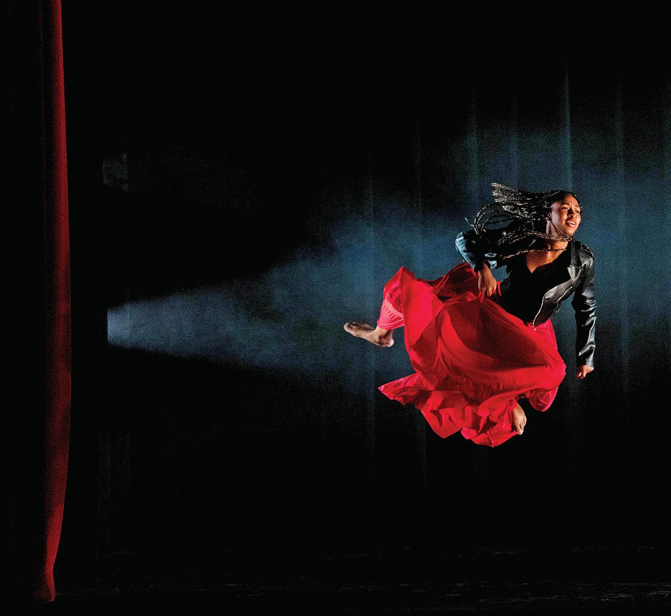 Airborne dancer during the Fall Dance Showcase in Bingham Auditorium.