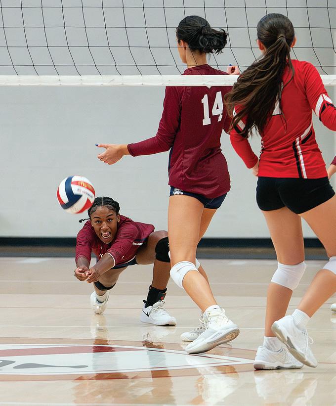 Maddy Little ’26 digs the ball to stave off a point against Kingswood Oxford on September 11.