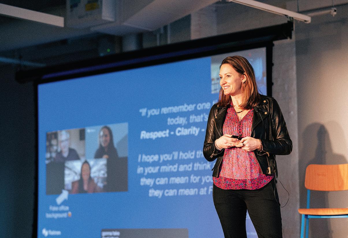 Starrett at one of Flatiron’s Everyone@, an all-company meeting where teams across the business share updates