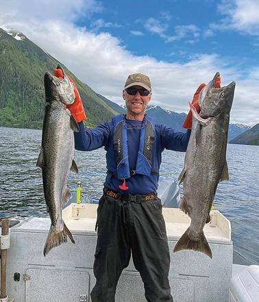 Carpenter with a pair of king salmon caught off the coast of Sitka, Alaska, aboard his boat, Miss Adventure, during a trip guiding clients on a wilderness therapy adventure