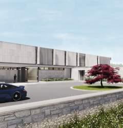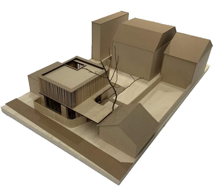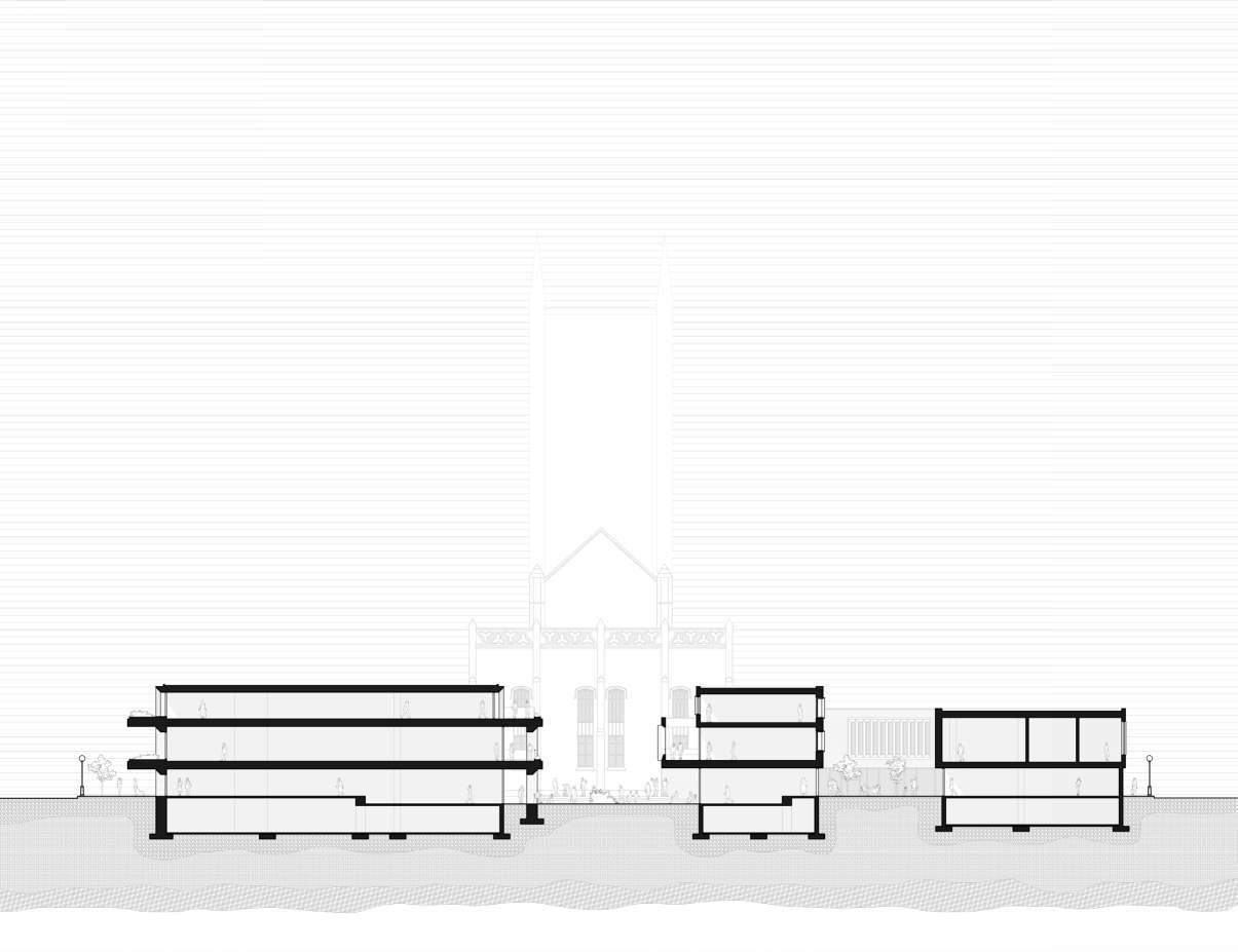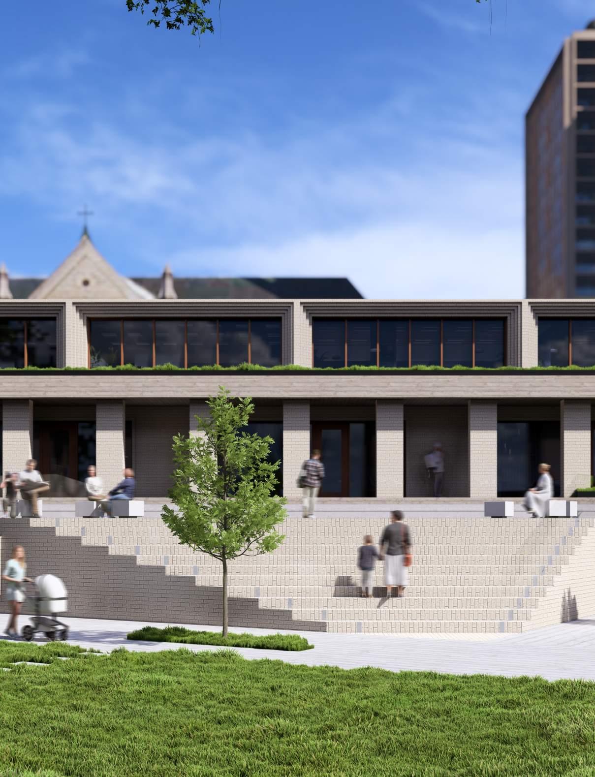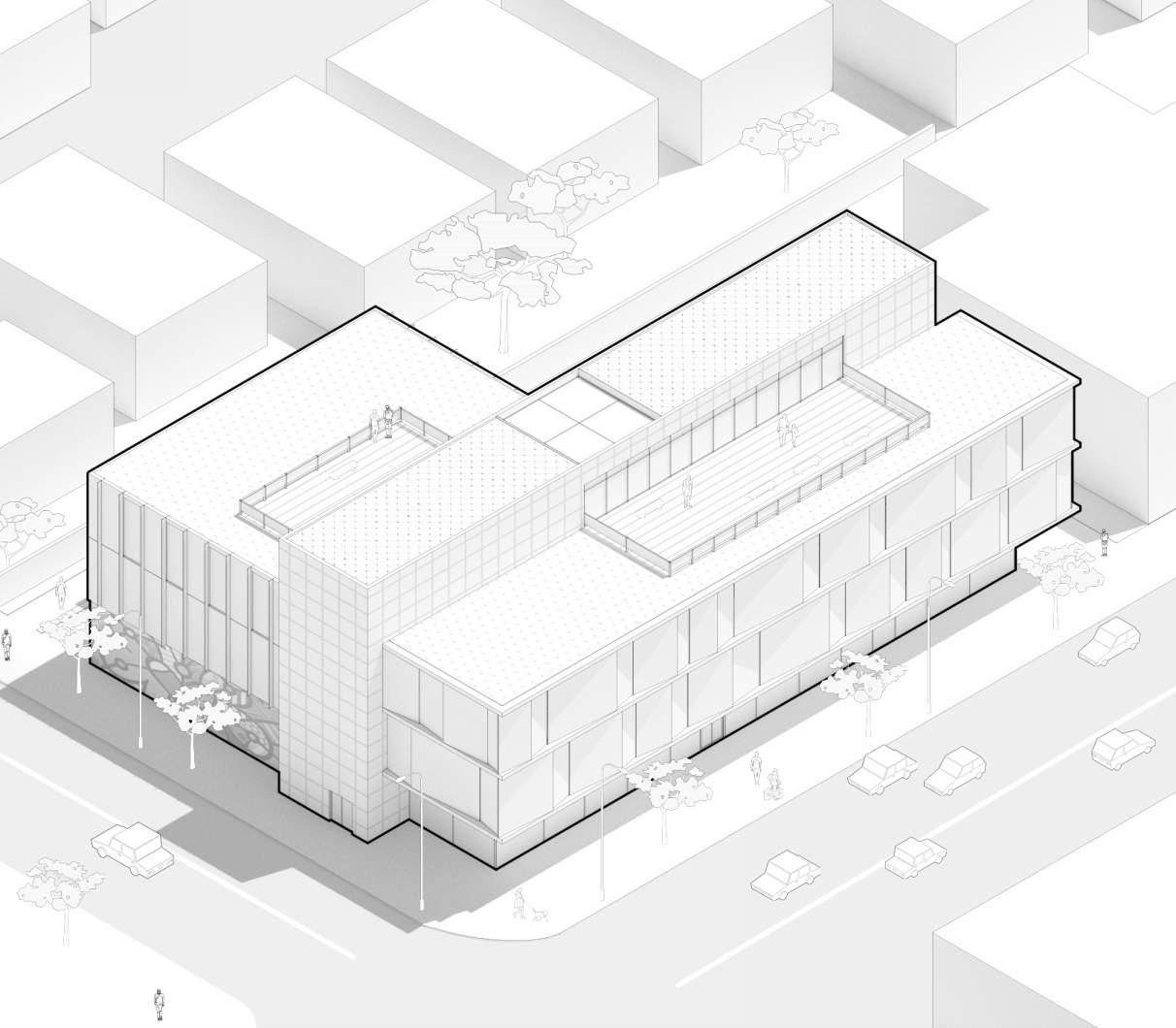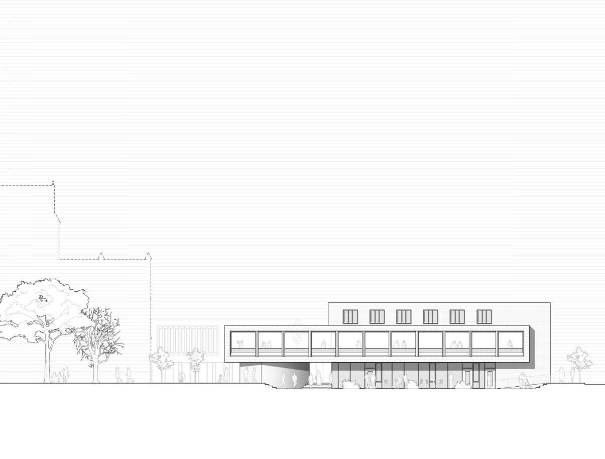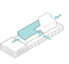 Sculpting the facade to gesture towards the existing building and emphasize its importance on the site.