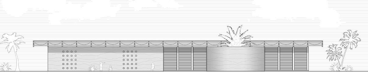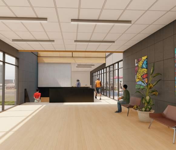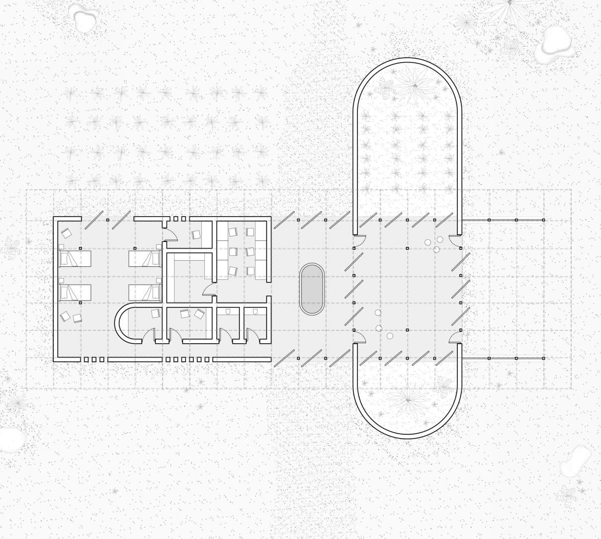 The private spaces are tucked away from public view, with only small and controlled openings for light. On the opposite side of the foyer lies the interactive education space. This space is intersected with gently curved walls which provide protected outdoor courtyards . These courtyards act as gardens which are utilized as interactive agricultural education spaces. These spaces provide a practical and safe environment for children of all ages to learn and experience local agricultural practices first hand. Pivoting doors provide seamless integration to the outdoor education space, providing flexibility in the use of the surrounding site.