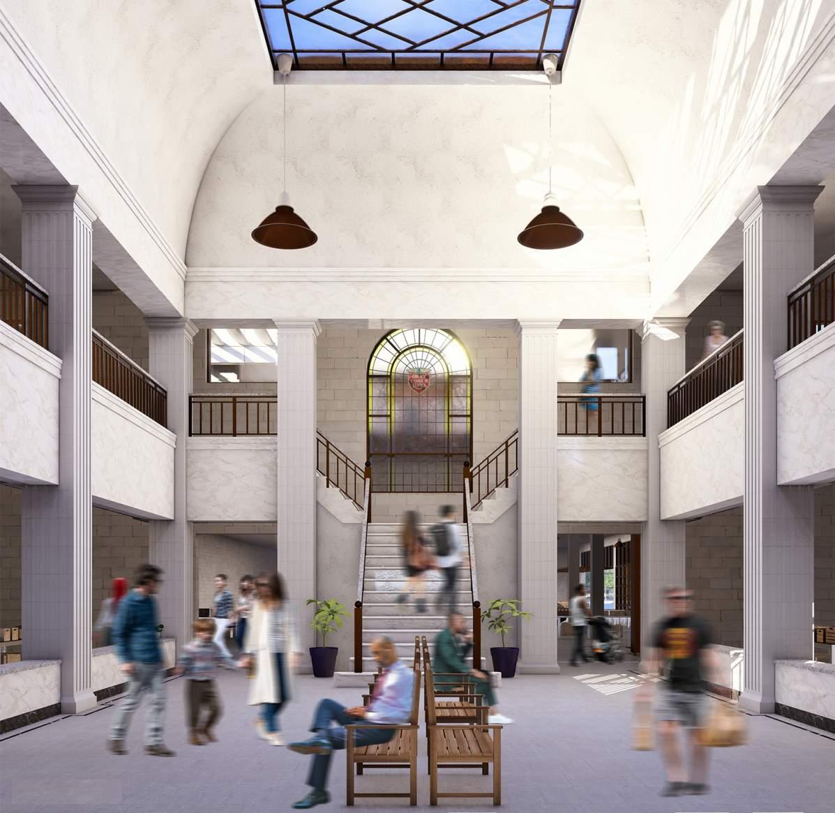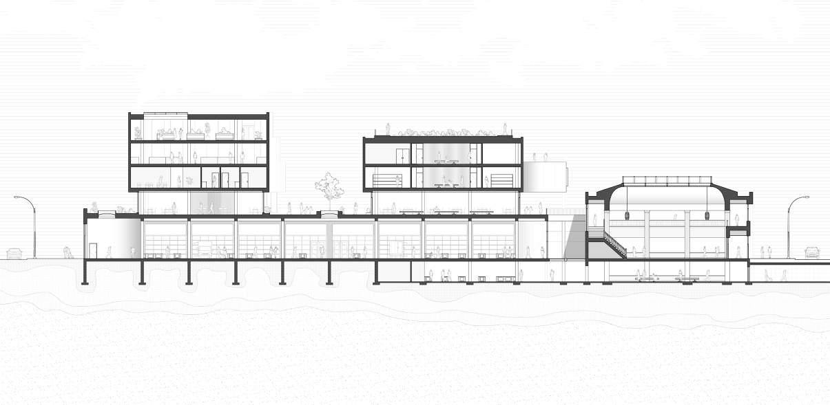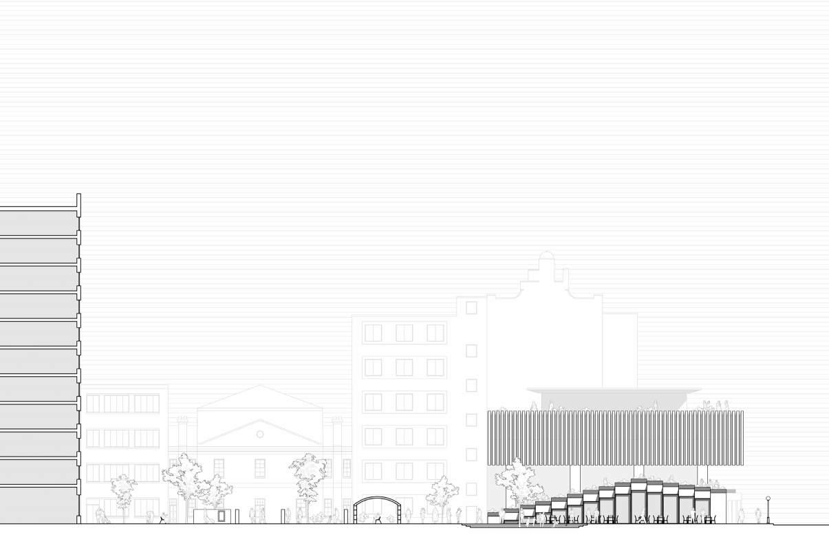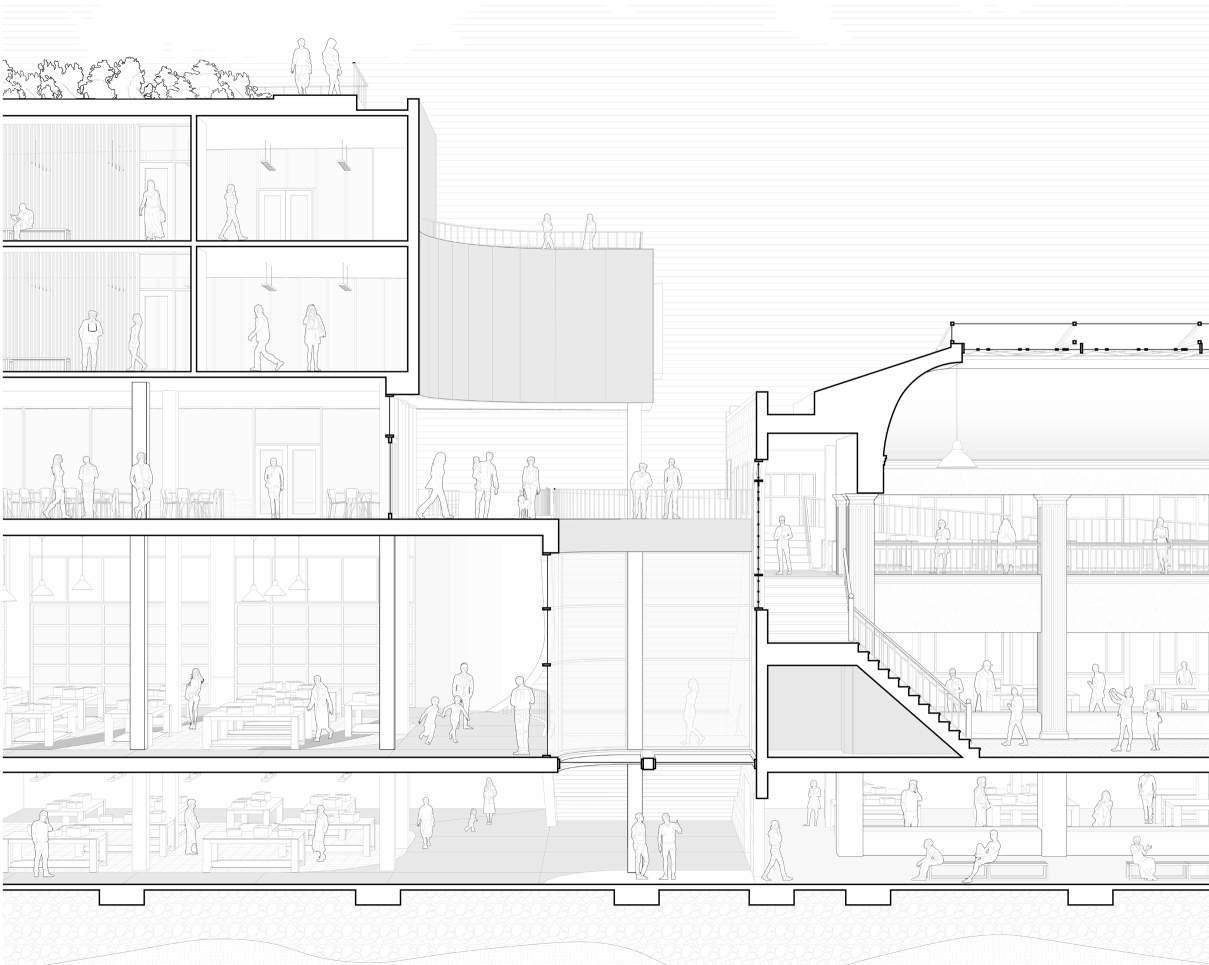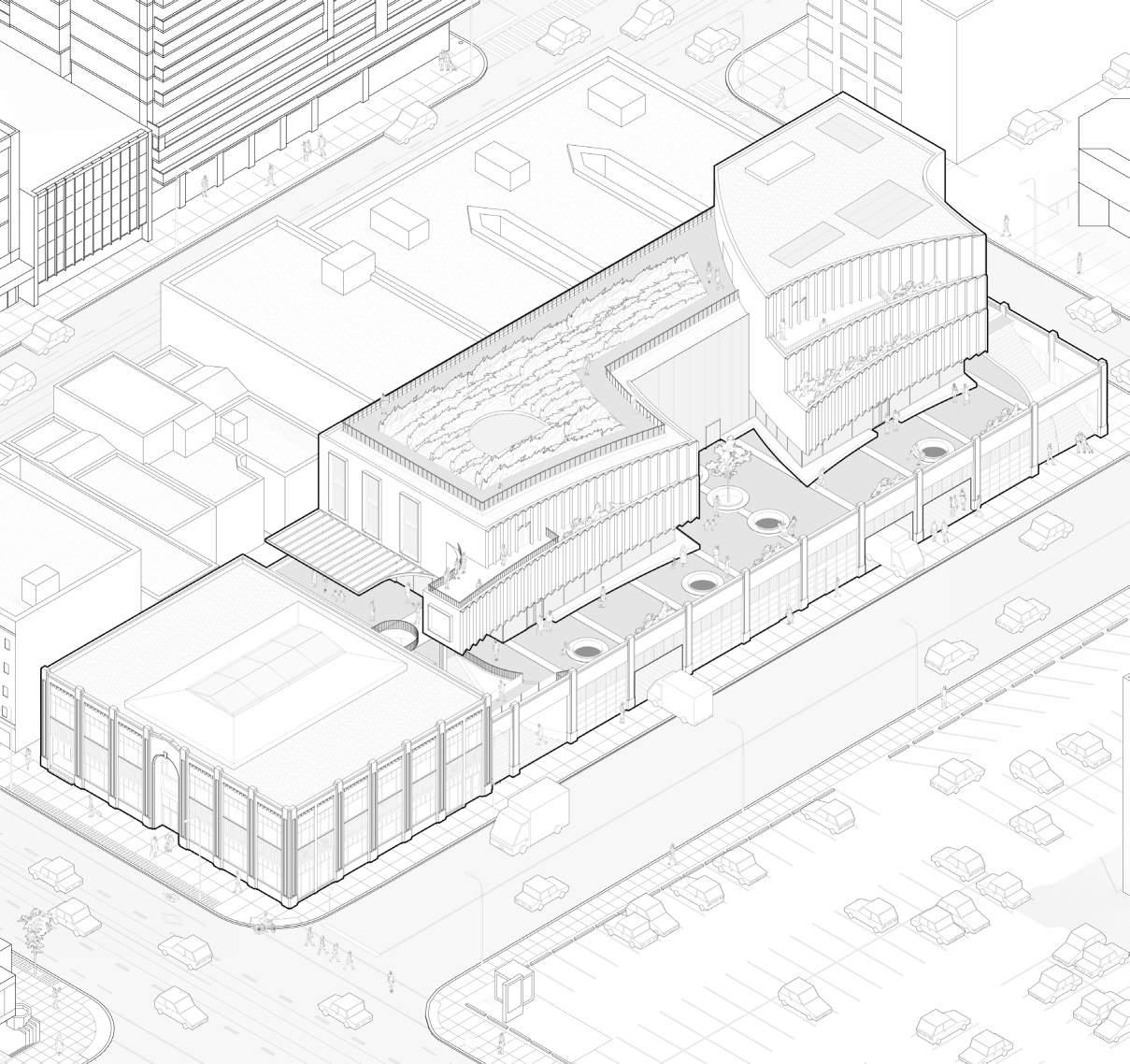 The Gray Coach Terminal conceptualizes a new life for a disused bus station in downtown Toronto. It envisions a lively market place that embraces the original art deco building and bus bays. The original circulation paths of buses through the terminal are reflected in the new forms above which house community programming and retail areas.